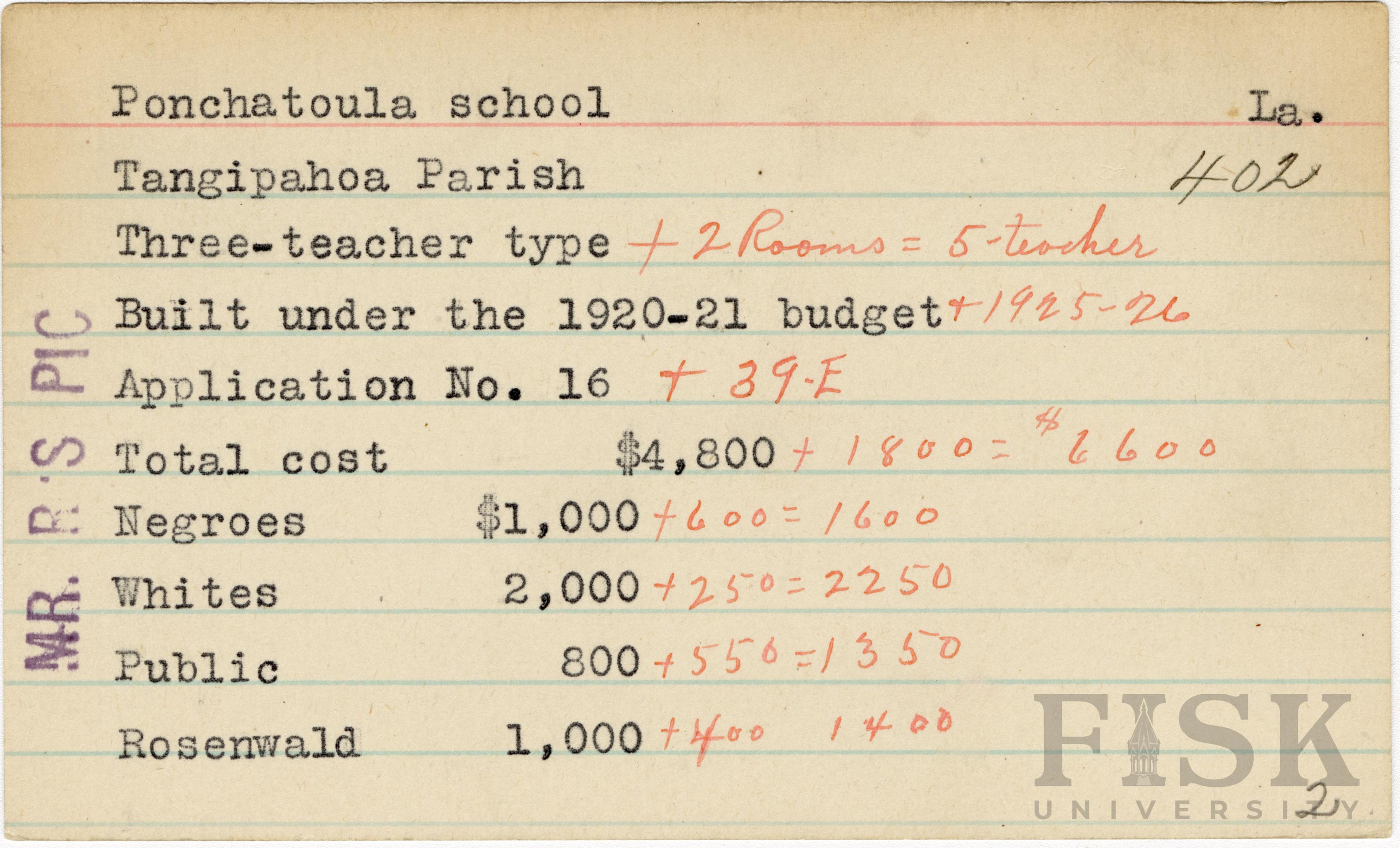 - School card from the Rosenwald Fund for Ponchatoula School in Tangipohoa Parish, Louisiana with handwritten additions to the teacher type, budget year, application number, and budget contribution sections. A note on the far left of the card that says, "Mr. R's Pic"
