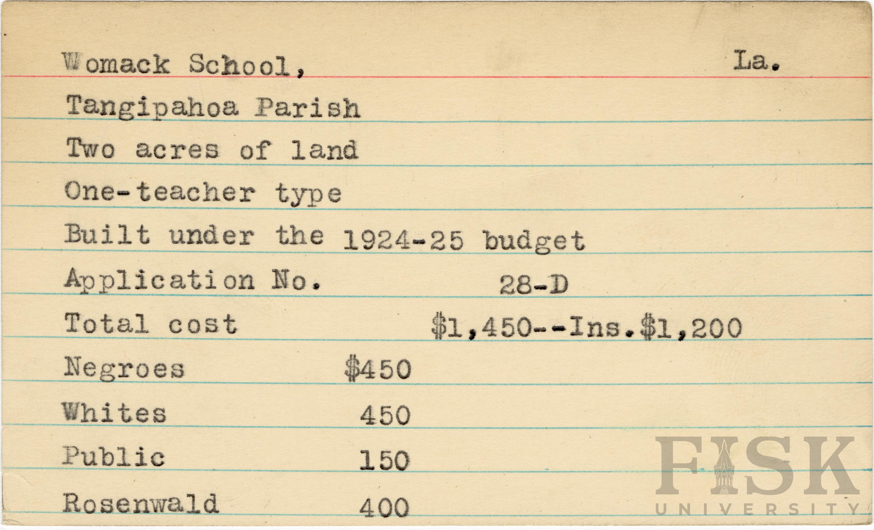 - School card from the Rosenwald Fund for Womack School in Tangipohoa Parish, Louisiana with a section added to the budget contributions that says, "Ins. $1,200"