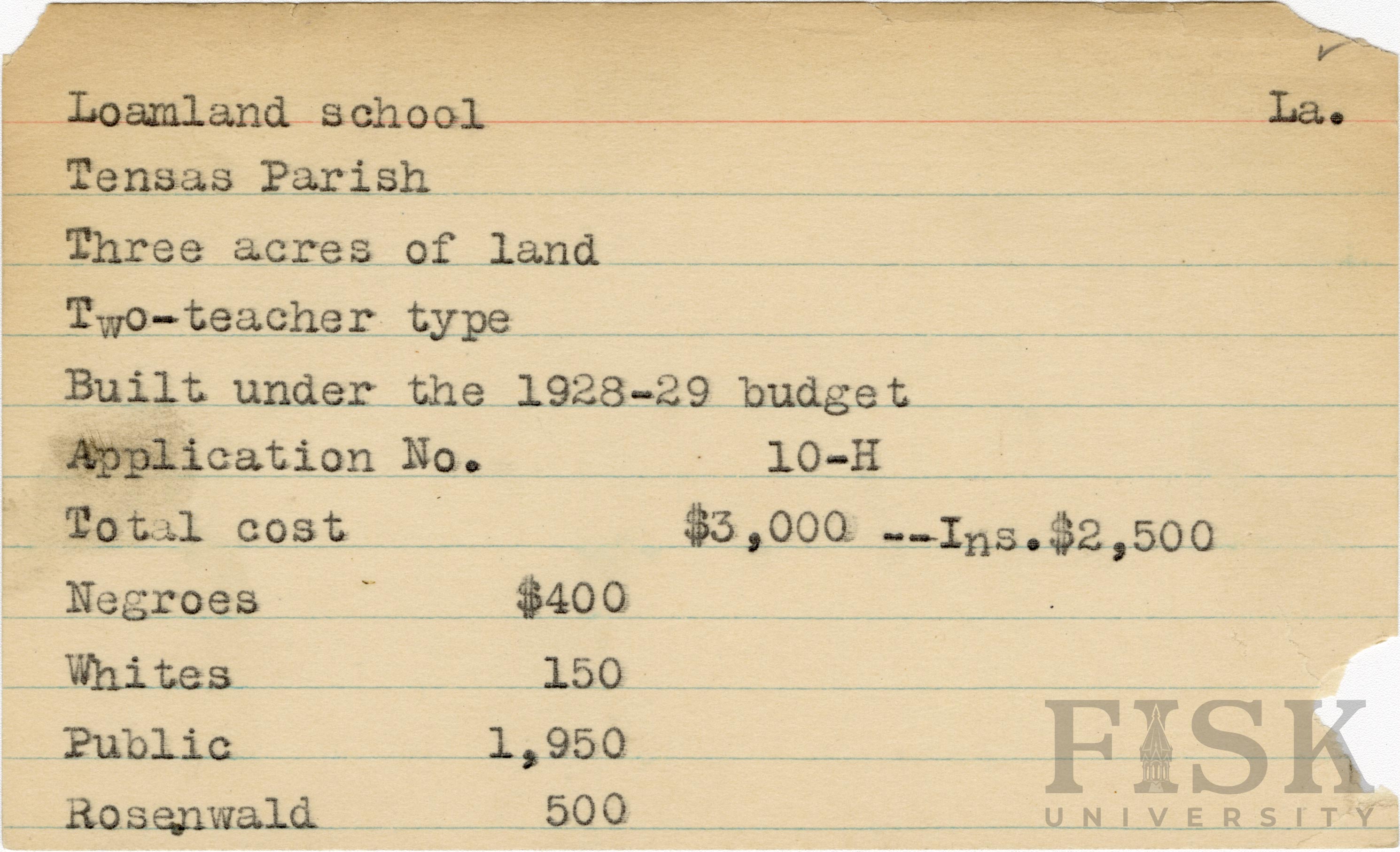 School card from the Rosenwald Fund for Loamland School in Tensas Parish, Louisiana with a section added to the budget contributions that says, "Ins. $2,500"