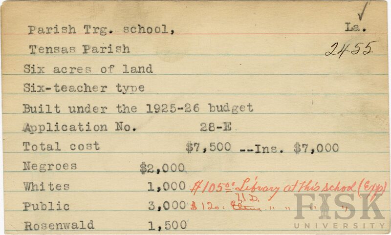 - School card from the Rosenwald Fund for Parish Training School in Tensas Parish, Louisiana with a section added to the budget contributions that says, "Ins. $7,000". Handwritten notes on the card say, "$105.00 library at this school (Exp)" and "$120 H.S. library at this school"