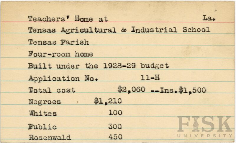 - School card from the Rosenwald Fund for the four room teacher's home at Tensas Ag. & Ind. School in Tensas Parish, Louisiana with a section added to the budget contributions that says, "Ins. $1,500"