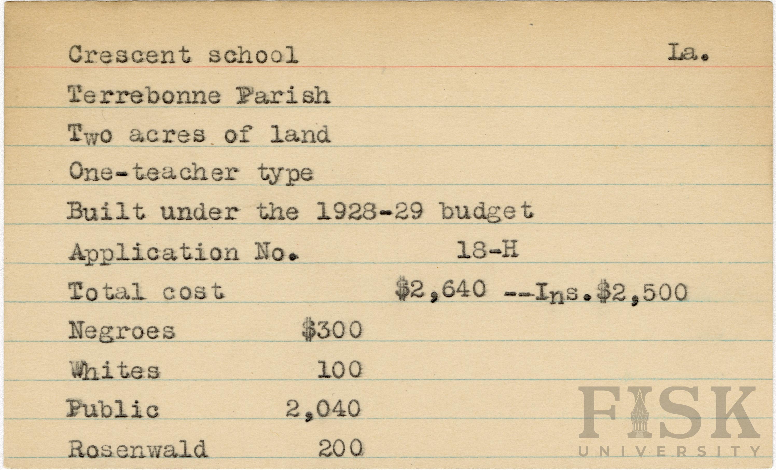 School card from the Rosenwald Fund for Crescent School in Terrebonne Parish, Louisiana with a section added to the budget contributions that says, "Ins. $2,500"