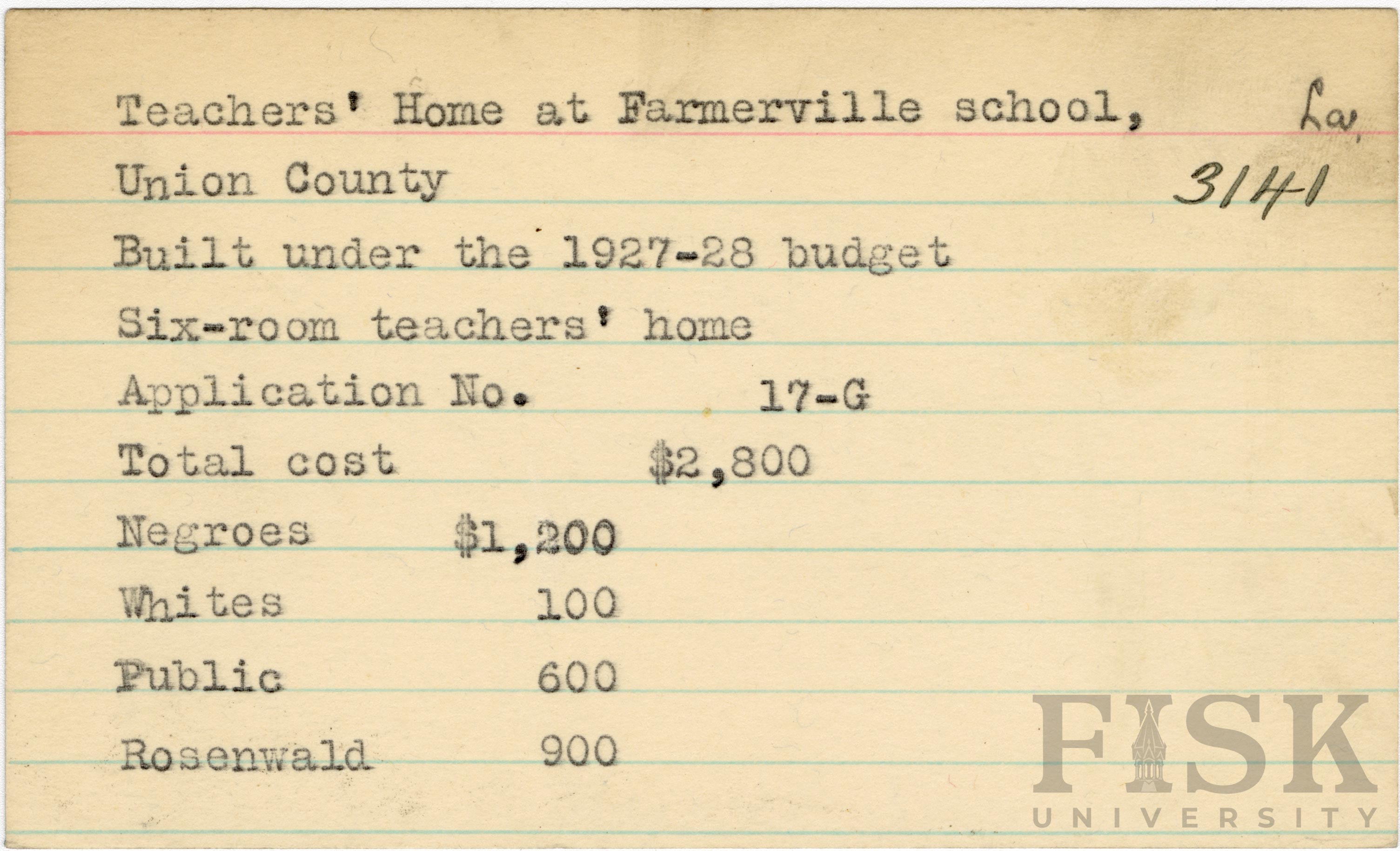 - School card from the Rosenwald Fund for the six room teacher's home at Farmerville School in Union Parish, Louisiana