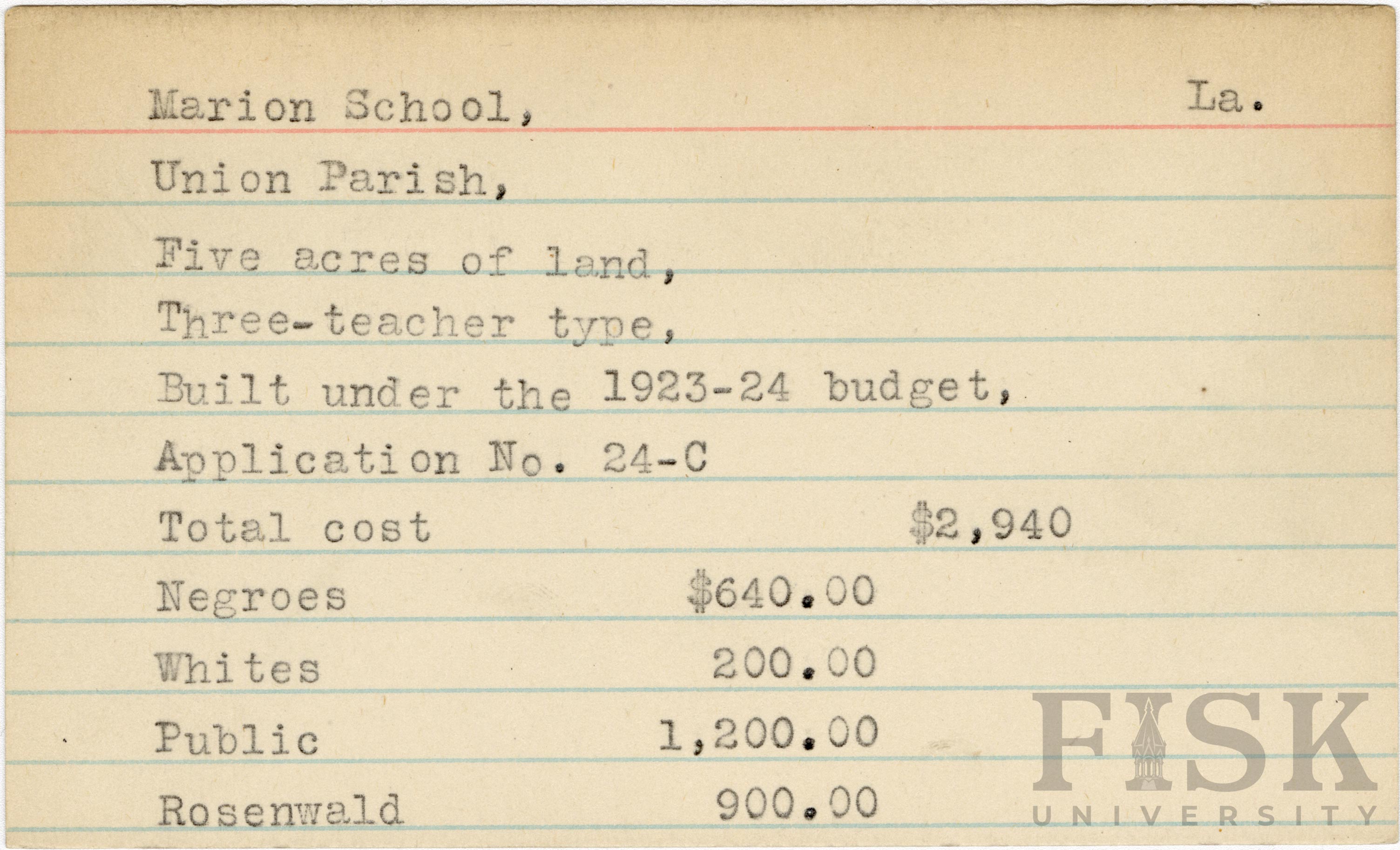 - School card from the Rosenwald Fund for Marion School in Union Parish, Louisiana
