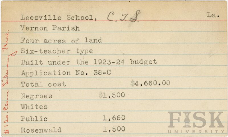 - School card from the Rosenwald Fund for Leesville School in Vernon Parish, Louisiana with a note on the far left of the card that says, "$120 elem library here"