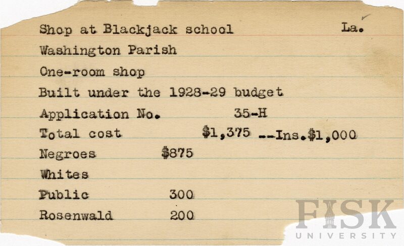 School card from the Rosenwald Fund for the one room shop at Black Jack School in Washington Parish, Louisiana with a section added to the budget contributions that says, "Ins. $1,000"