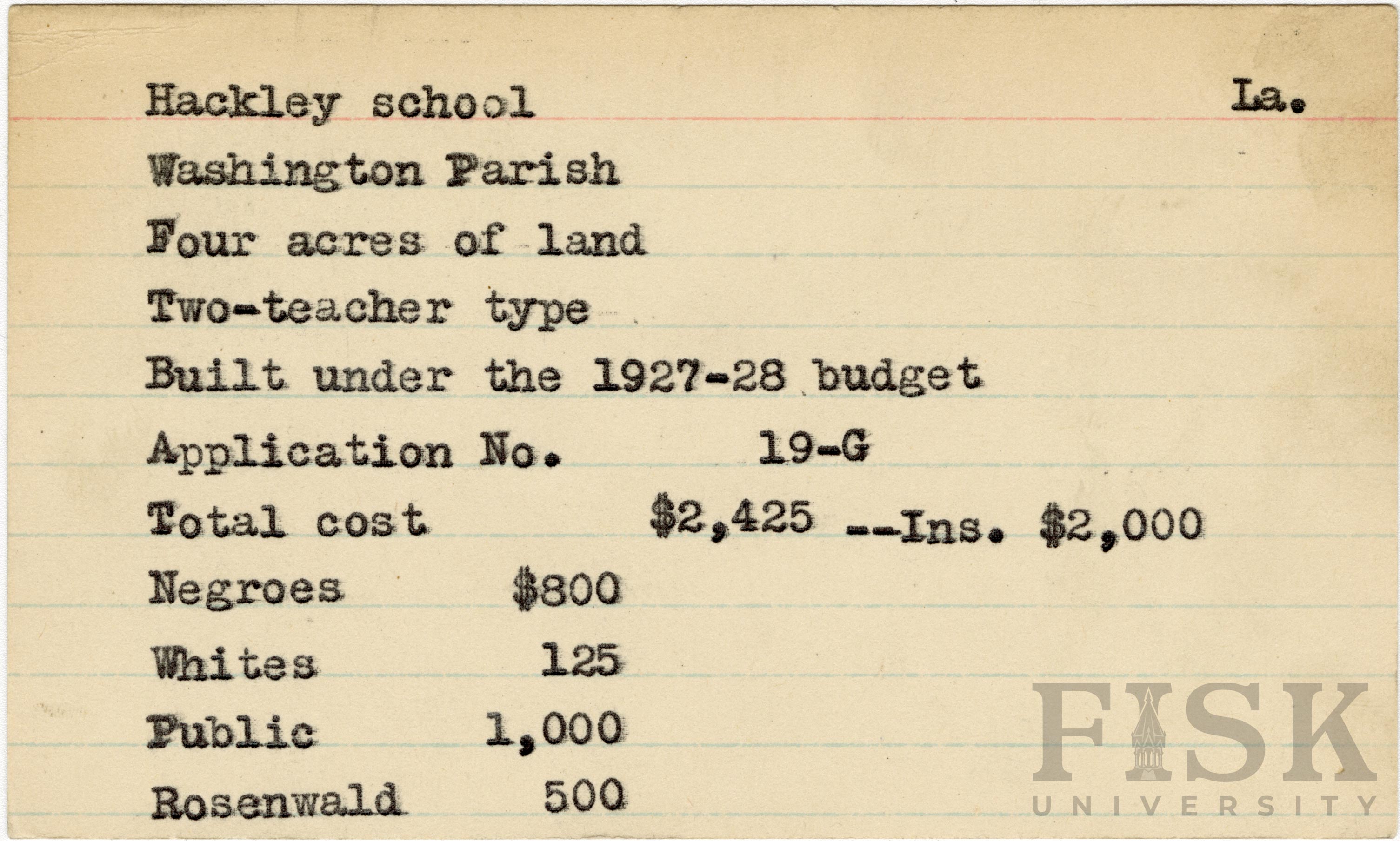 School card from the Rosenwald Fund for Hackley School in Washington Parish, Louisiana with a section added to the budget contributions that says, "Ins. $2,000"