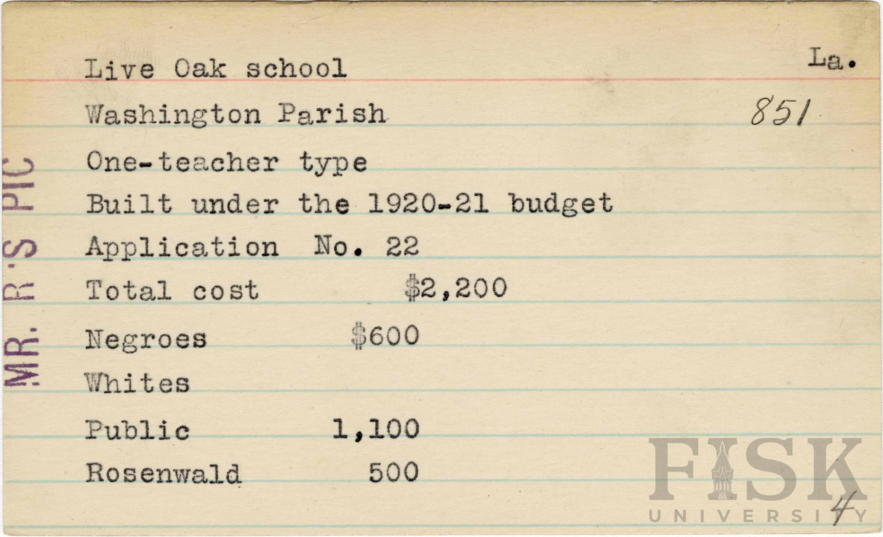 - School card from the Rosenwald Fund for Live Oak School in Washington Parish, Louisiana with a note on the far left of the card that says, "Mr. R's Pic"