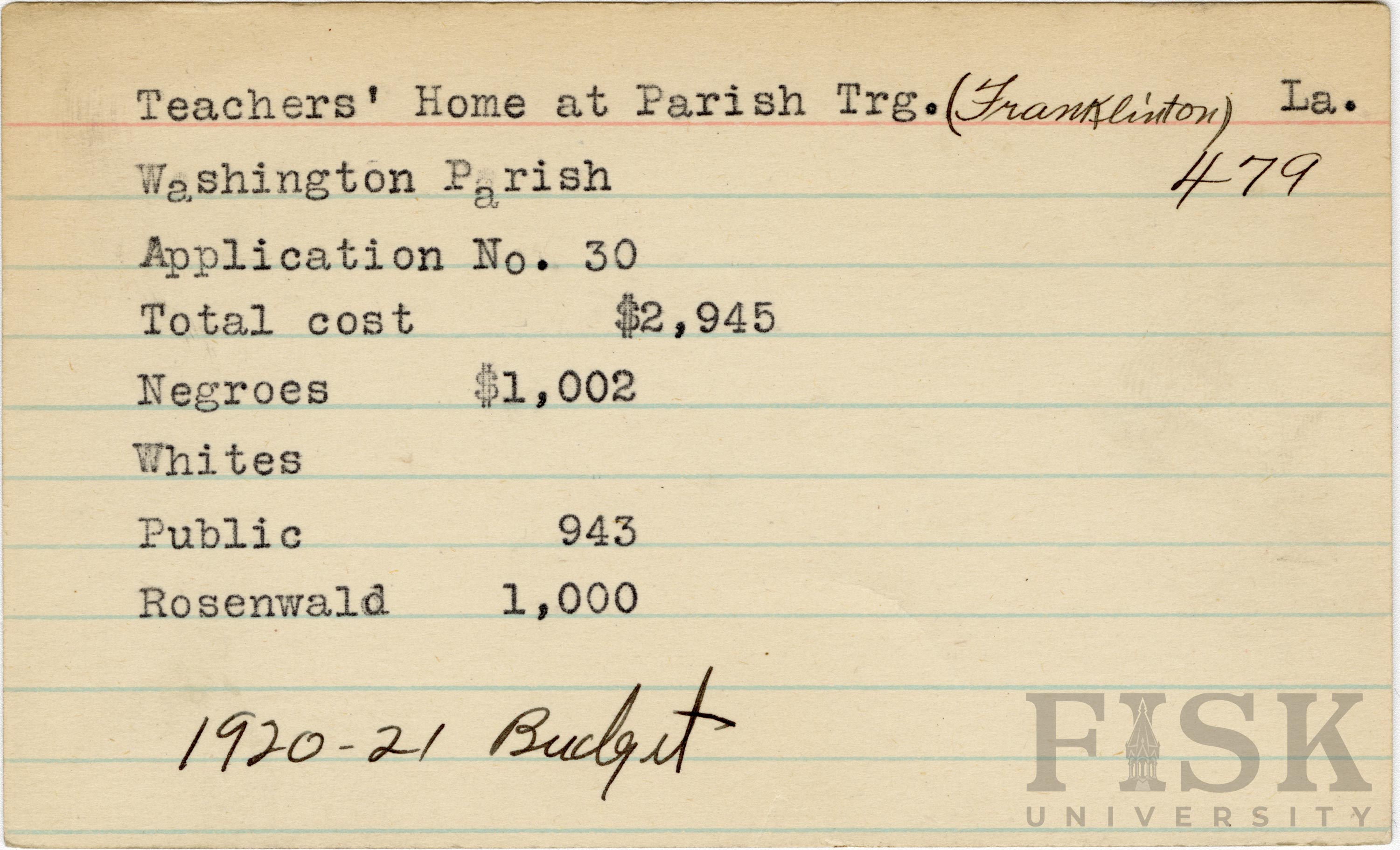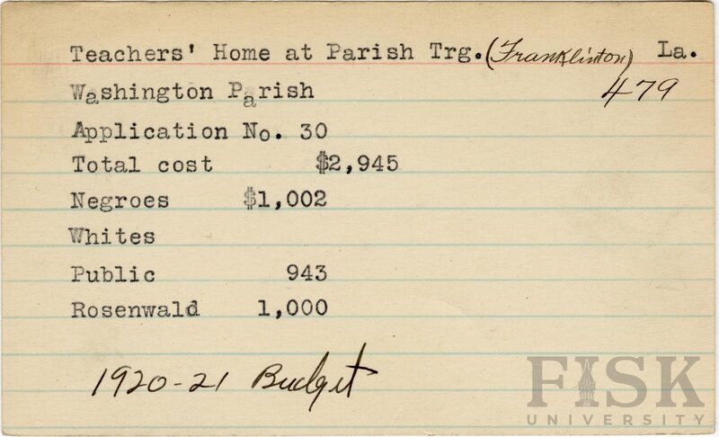 - School card from the Rosenwald Fund for the teacher's home at Franklinton School in Washington Parish, Louisiana