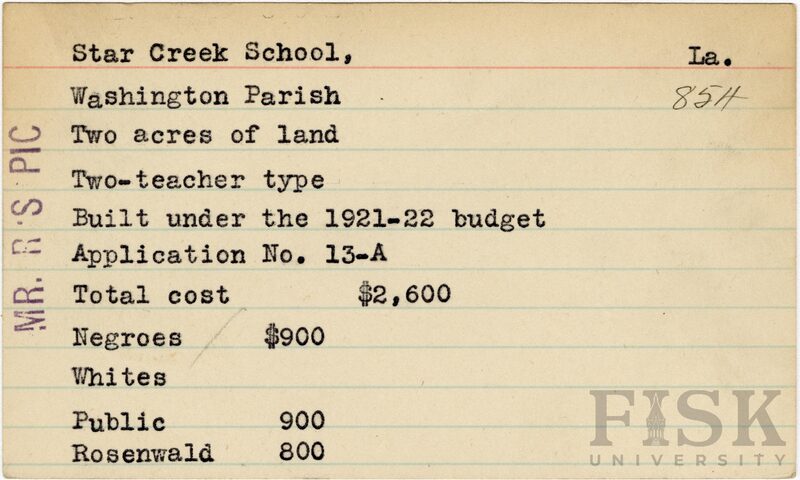 School card from the Rosenwald Fund for Star Creek School in Washington Parish, Louisiana with a note on the far left of the card that says, "Mr. R's Pic"