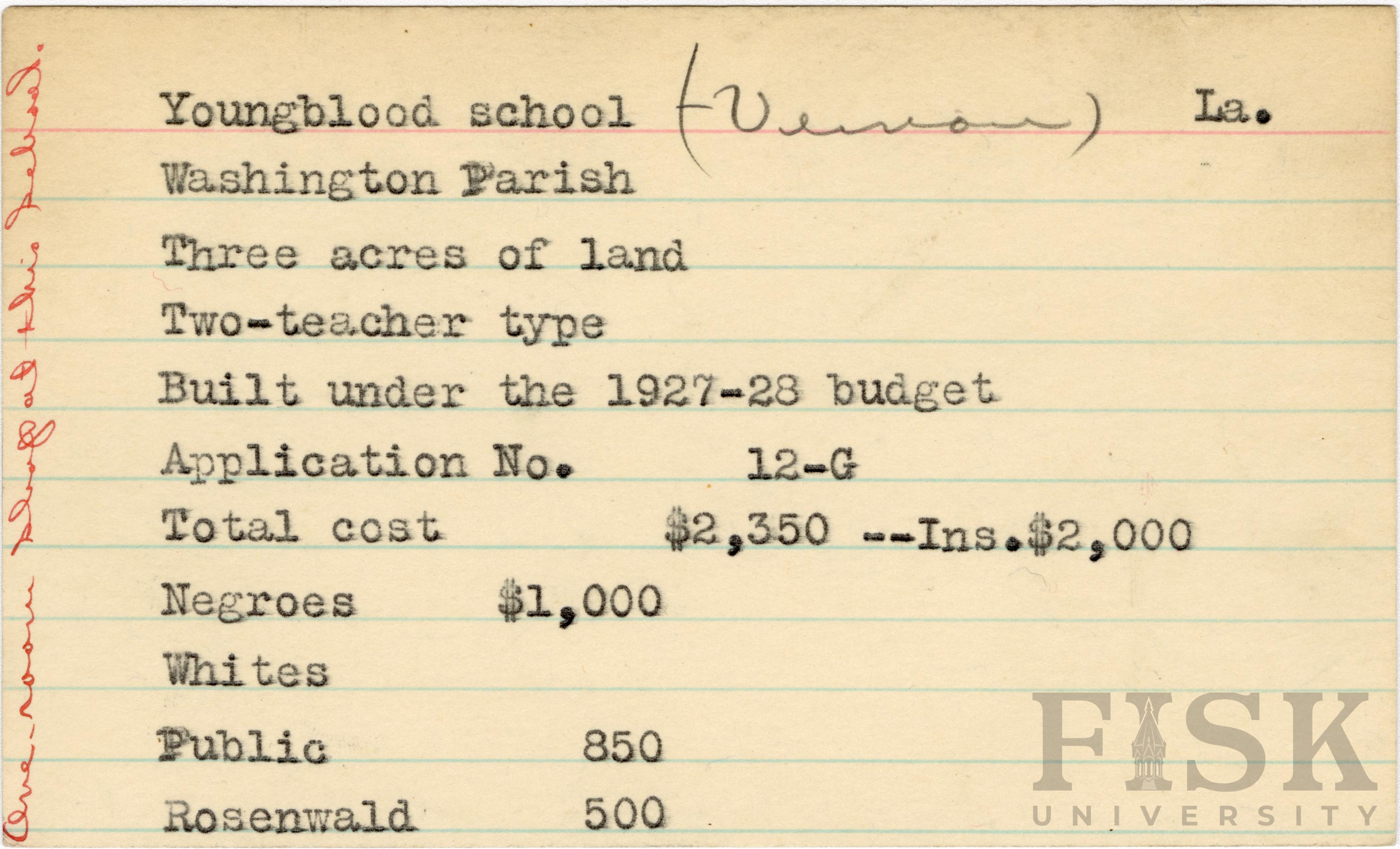 - School card from the Rosenwald Fund for Youngblood School in Washington Parish, Louisiana with a section added to the budget contributions that says, "Ins. $2,000" and a note on the far left of the card says, "one room shop at this school"