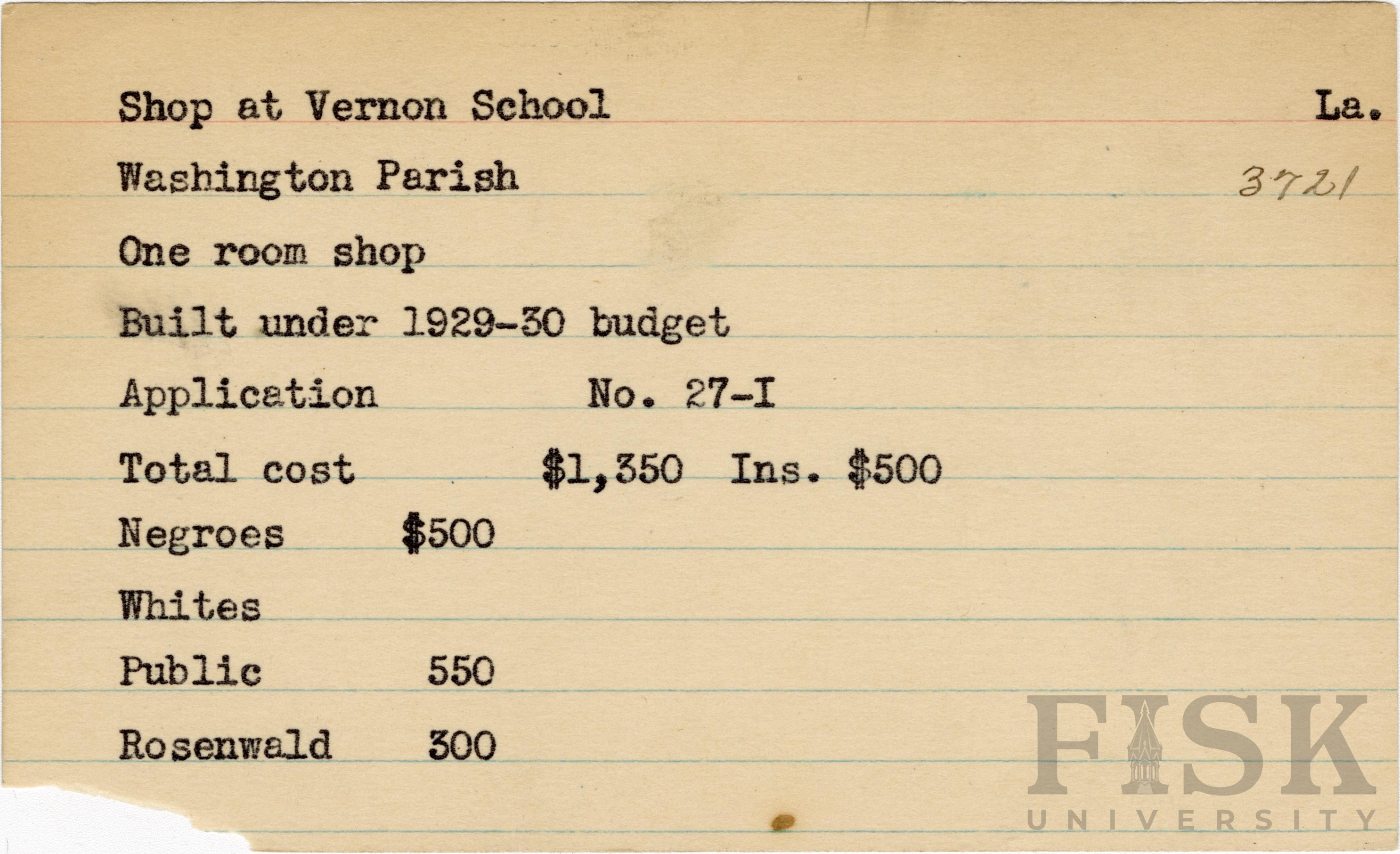 - School card from the Rosenwald Fund for the one room shop at Youngblood School in Washington Parish, Louisiana with a section added to the budget contributions that says, "Ins. $500"