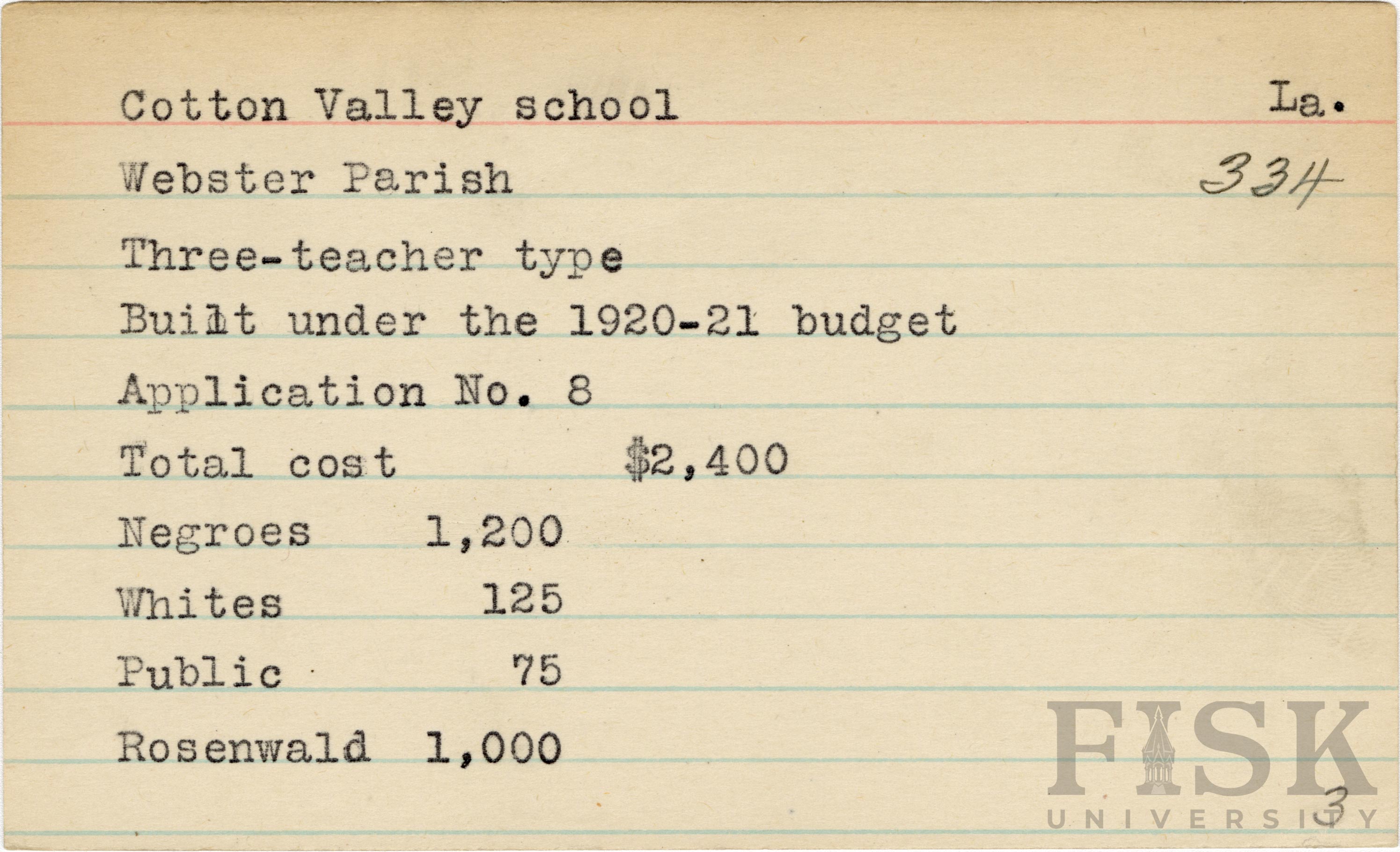School card from the Rosenwald Fund for Cotton Valley School in Webster Parish, Louisiana