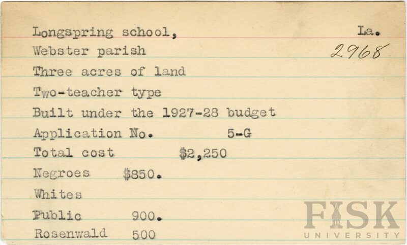 - School card from the Rosenwald Fund for Longspring School in Webster Parish, Louisiana