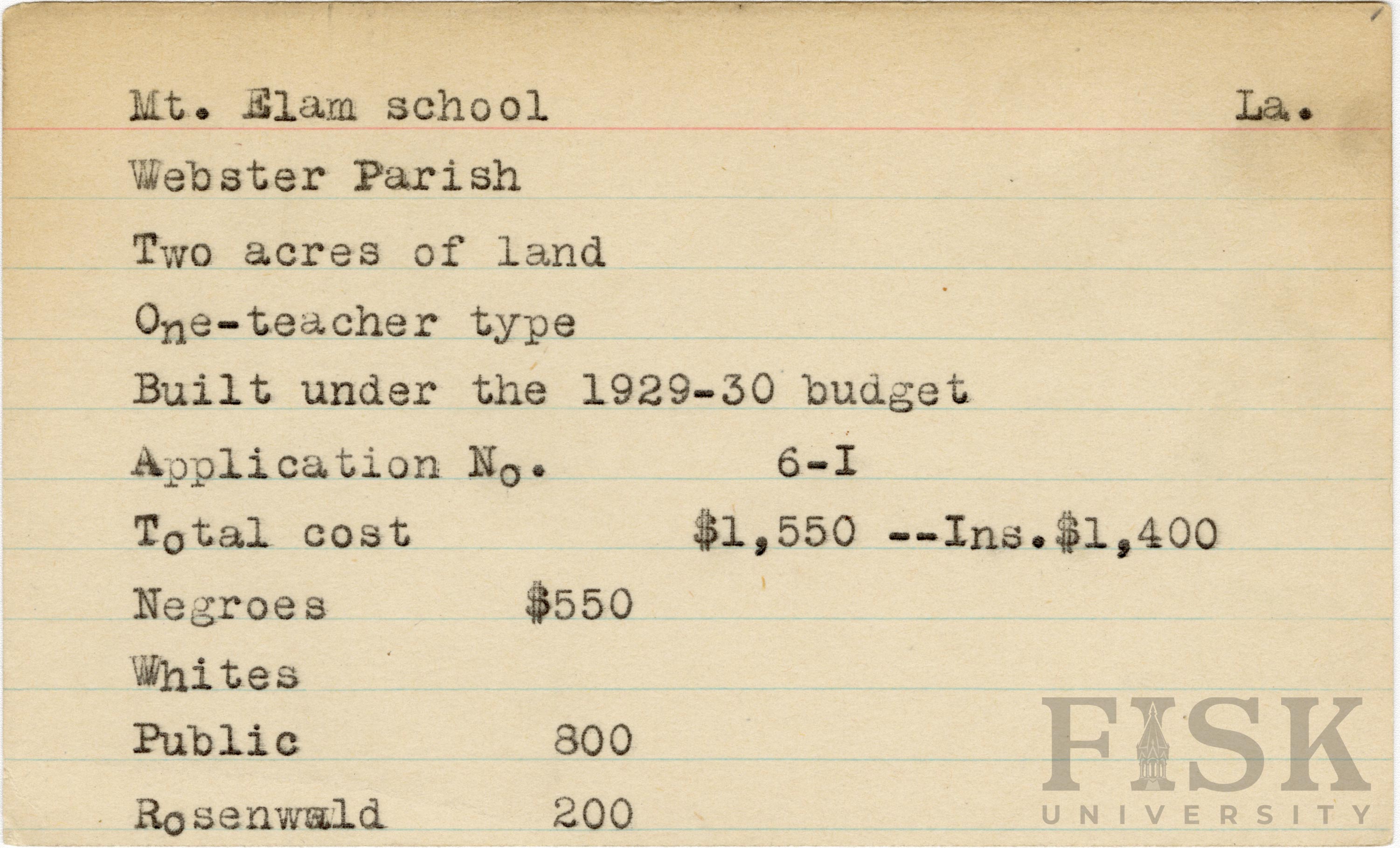 School card from the Rosenwald Fund for Mt. Elam School in Webster Parish, Louisiana with a section added to the budget contributions that says, "Ins. $1,400"