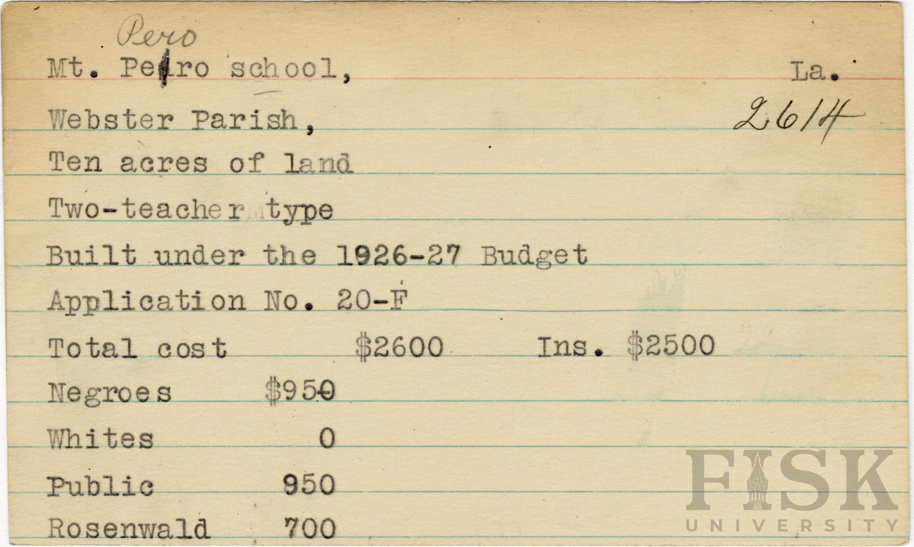 School card from the Rosenwald Fund for Mt. Pero School in Webster Parish, Louisiana with a section added to the budget contributions that says, "Ins. $2,500"