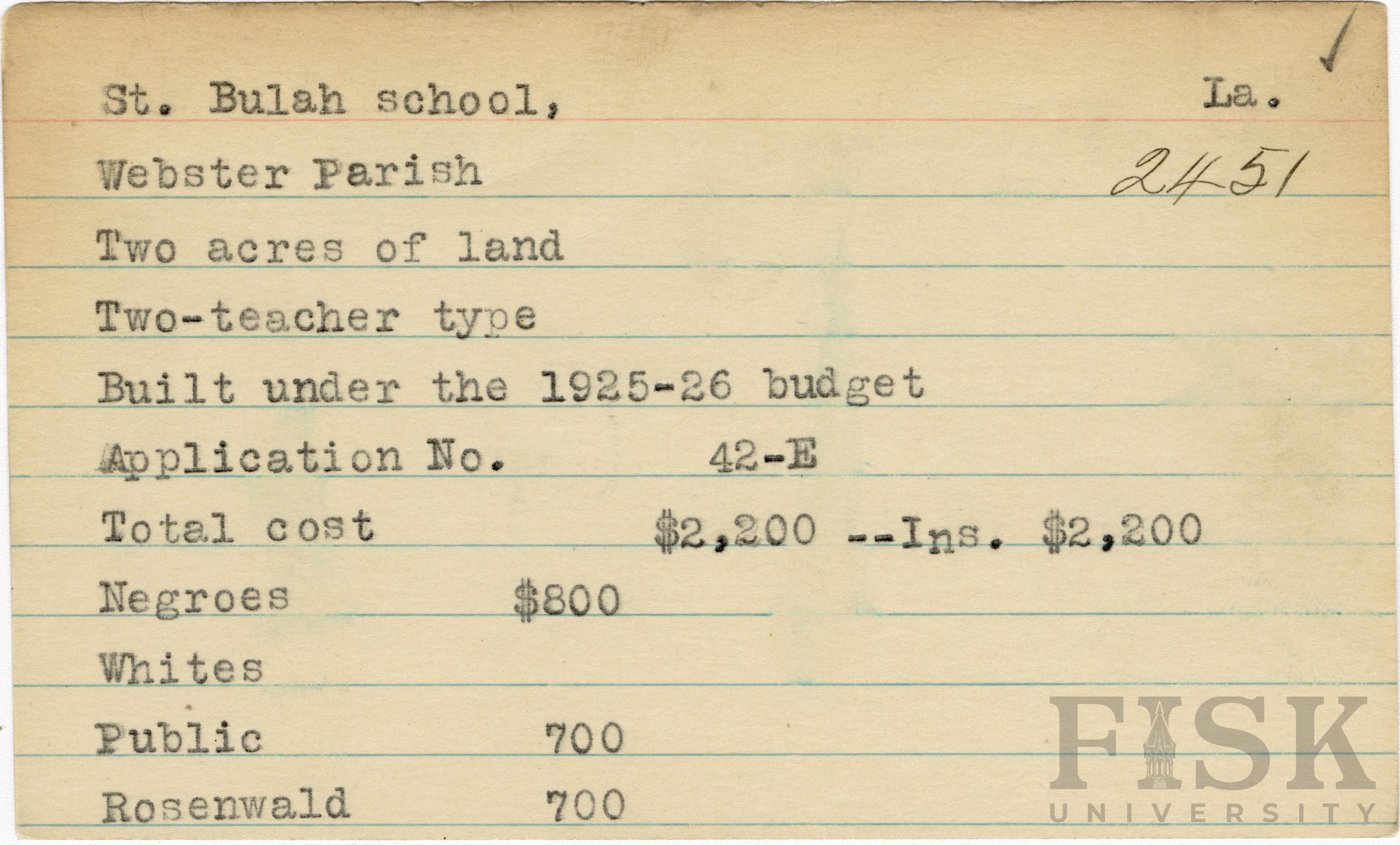 School card from the Rosenwald Fund for St. Bulah School in Webster Parish, Louisiana with a section added to the budget contributions that says, "Ins. $2,200"