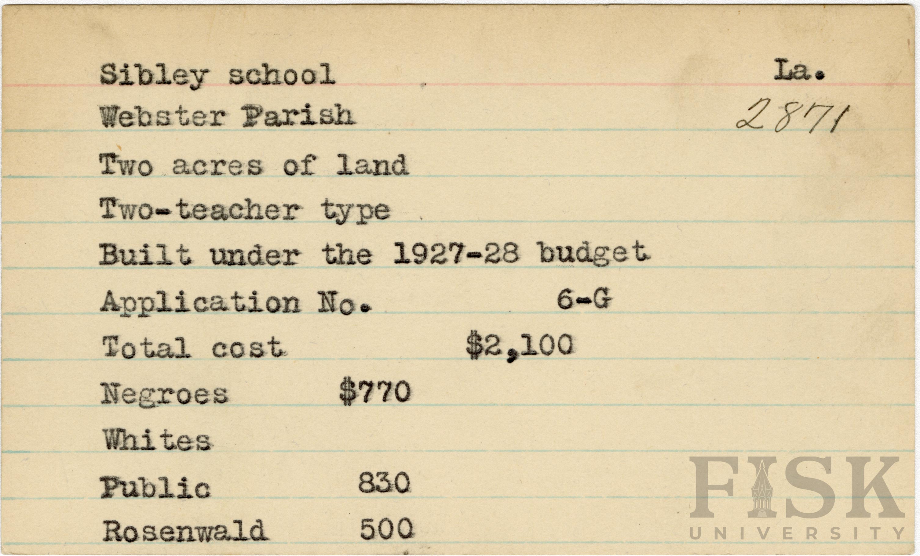 - School card from the Rosenwald Fund for Sibley School in Webster Parish, Louisiana
