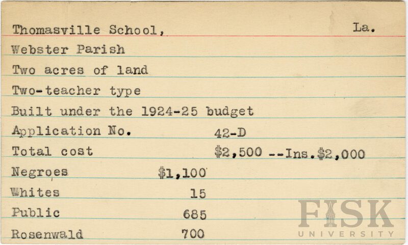 School card from the Rosenwald Fund for Thomasville School in Webster Parish, Louisiana with a section added to the budget contributions that says, "Ins. $2,000"