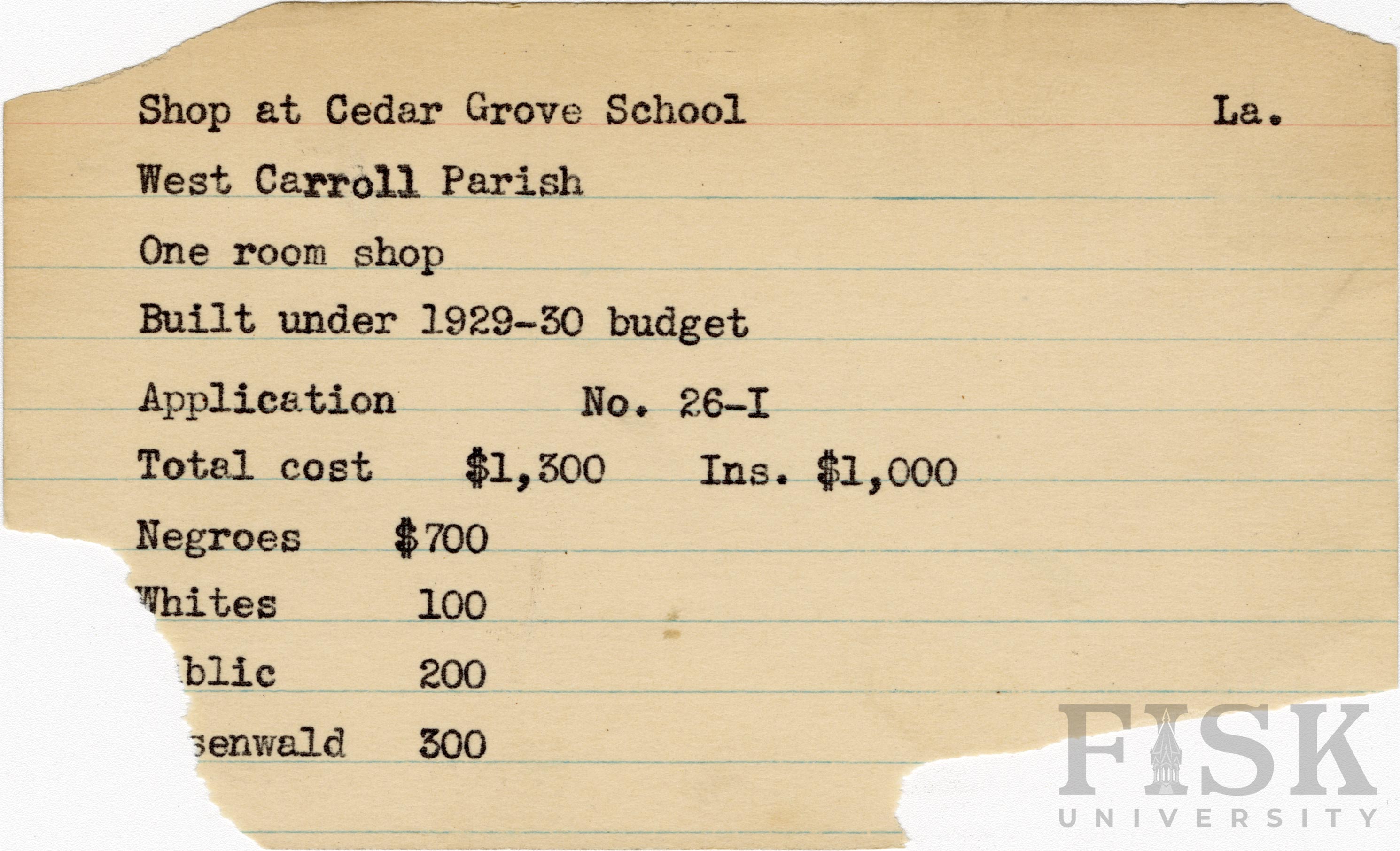 - School card from the Rosenwald Fund for the one room shop at Cedar Grove School in West Carroll Parish, Louisiana with a section added to the budget contributions that says, "Ins. $1,000"