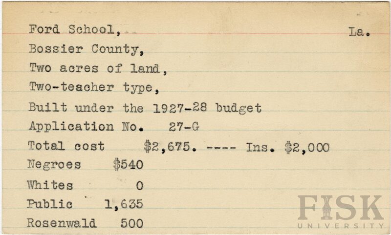 School card from the Rosenwald Fund for Ford School in Bossier Parish, Louisiana with a section added to the budget contributions that says, "Ins. $2,000"