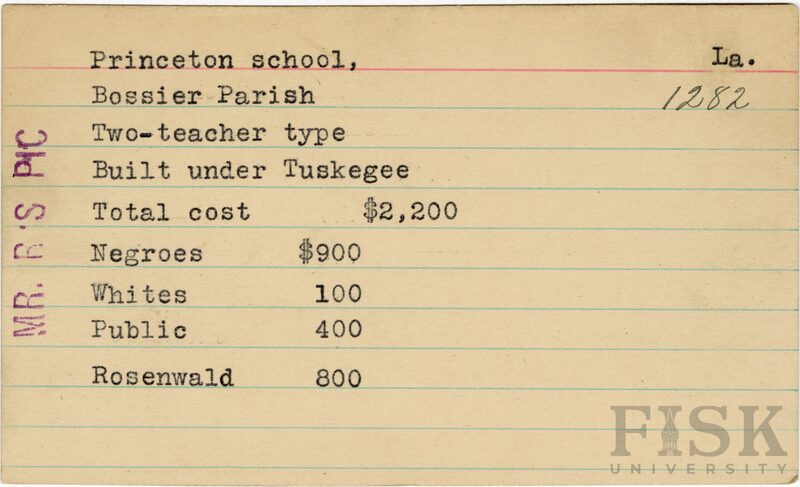 - School card from the Rosenwald Fund for Princeton School in Bossier Parish, Louisiana with a note on the card that says, "Mr. R's Pic"
