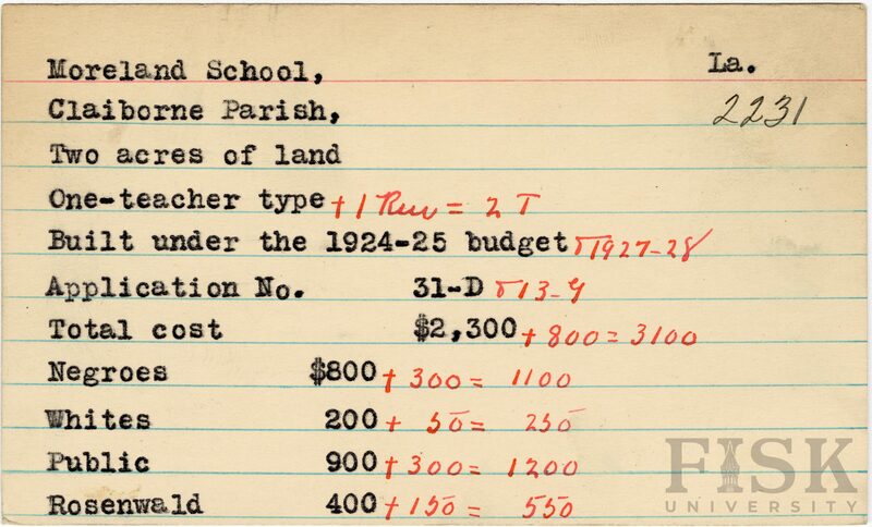 - School card from the Rosenwald Fund for Moreland School in Claiborne Parish, Louisiana with handwritten additions to the teacher type, budget year, application number, and budget contribution sections