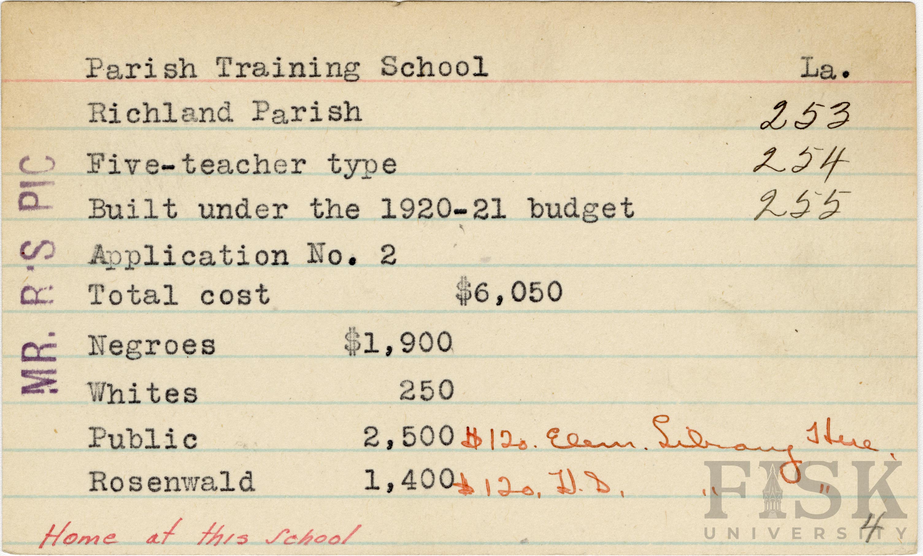 School card from the Rosenwald Fund for Parish Training School in Richland Parish, Louisiana with handwritten notes on the card that say, "Mr. R's Pic," "Home at this school," "$120 elem library here," and "$120 H.S. library here"