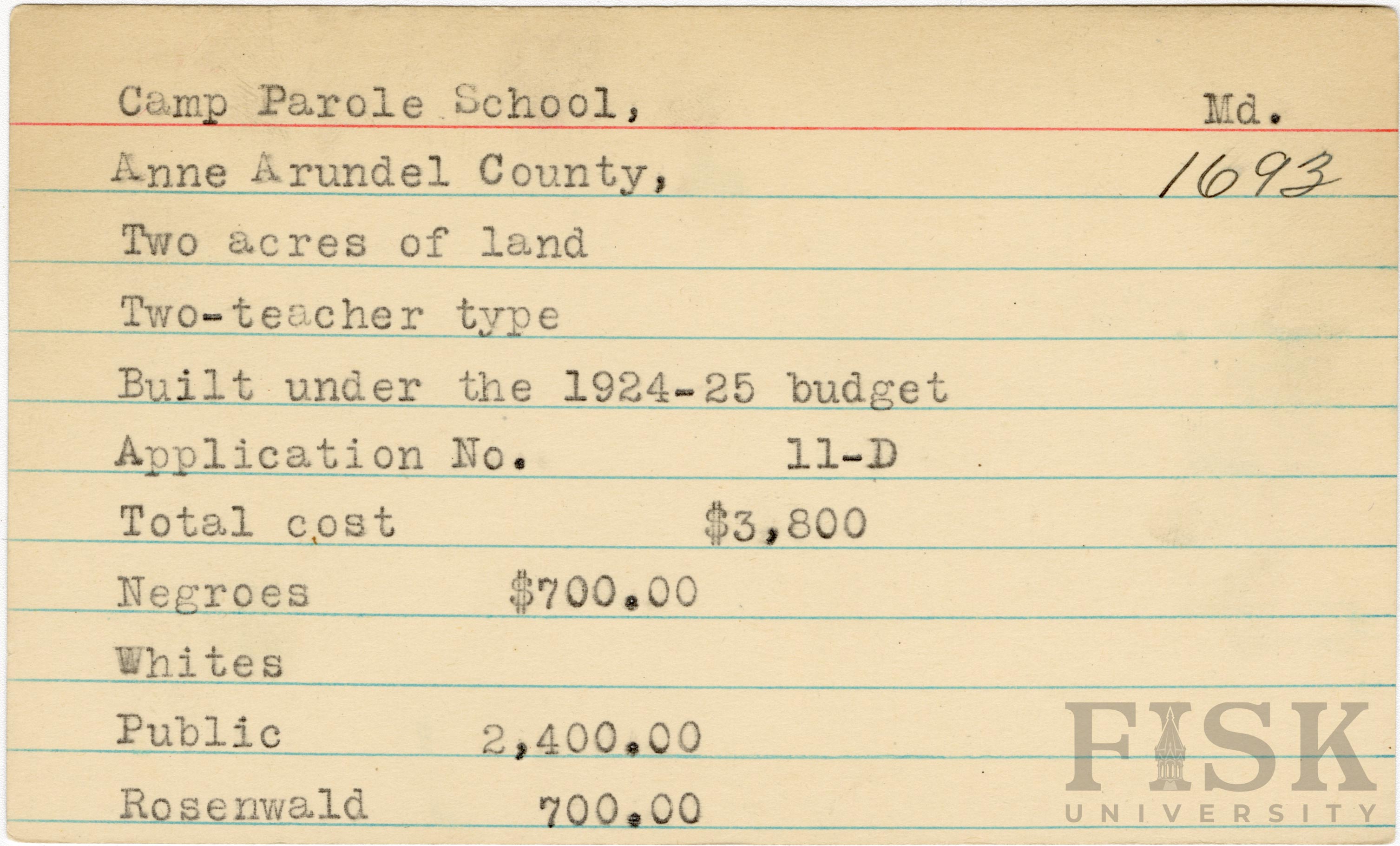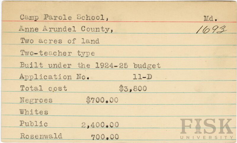 - School card from Rosenwald Fund for Camp Parole School in Anne Arundel County, Maryland