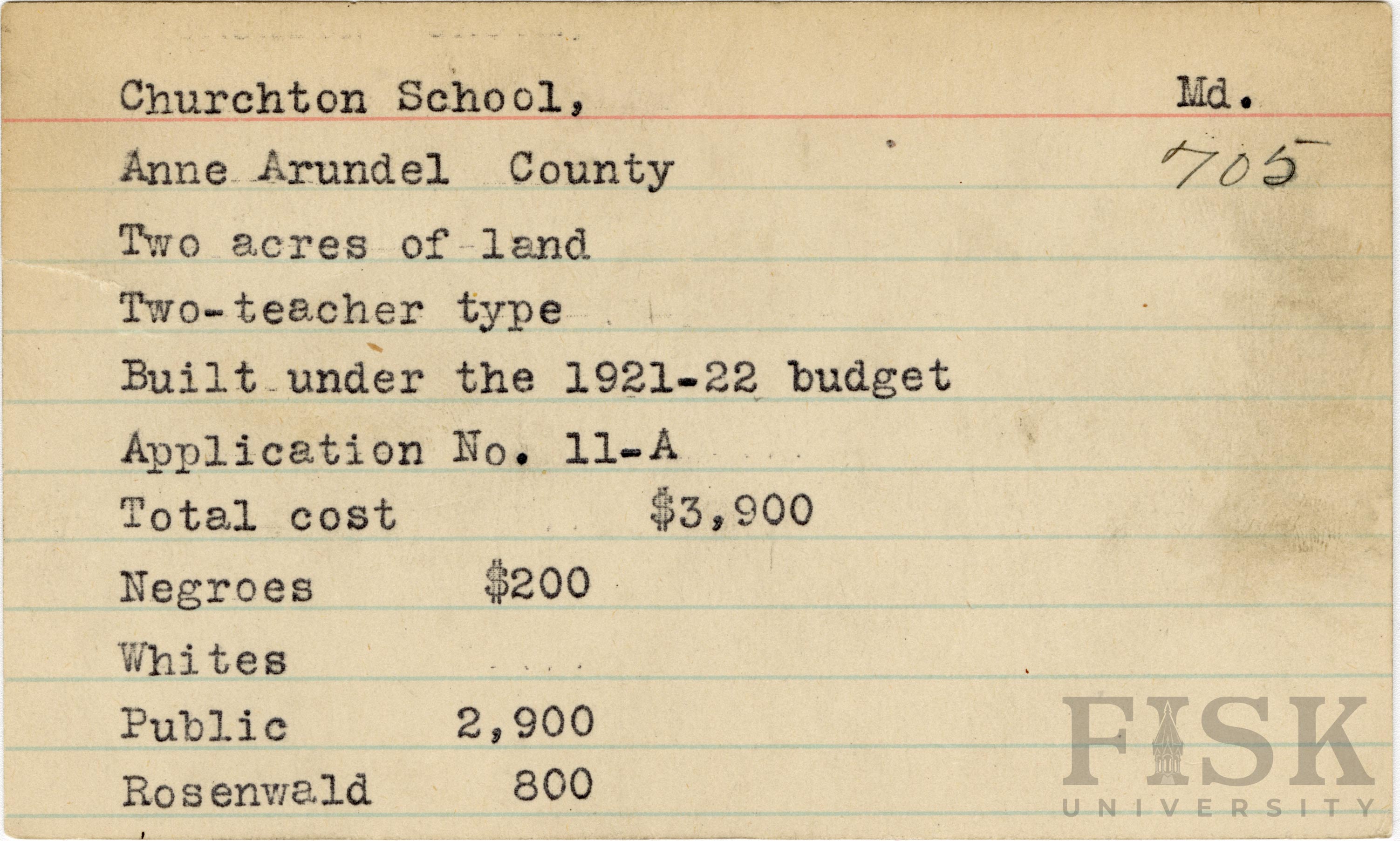 - School card from Rosenwald Fund for Churchton School in Anne Arundel County, Maryland