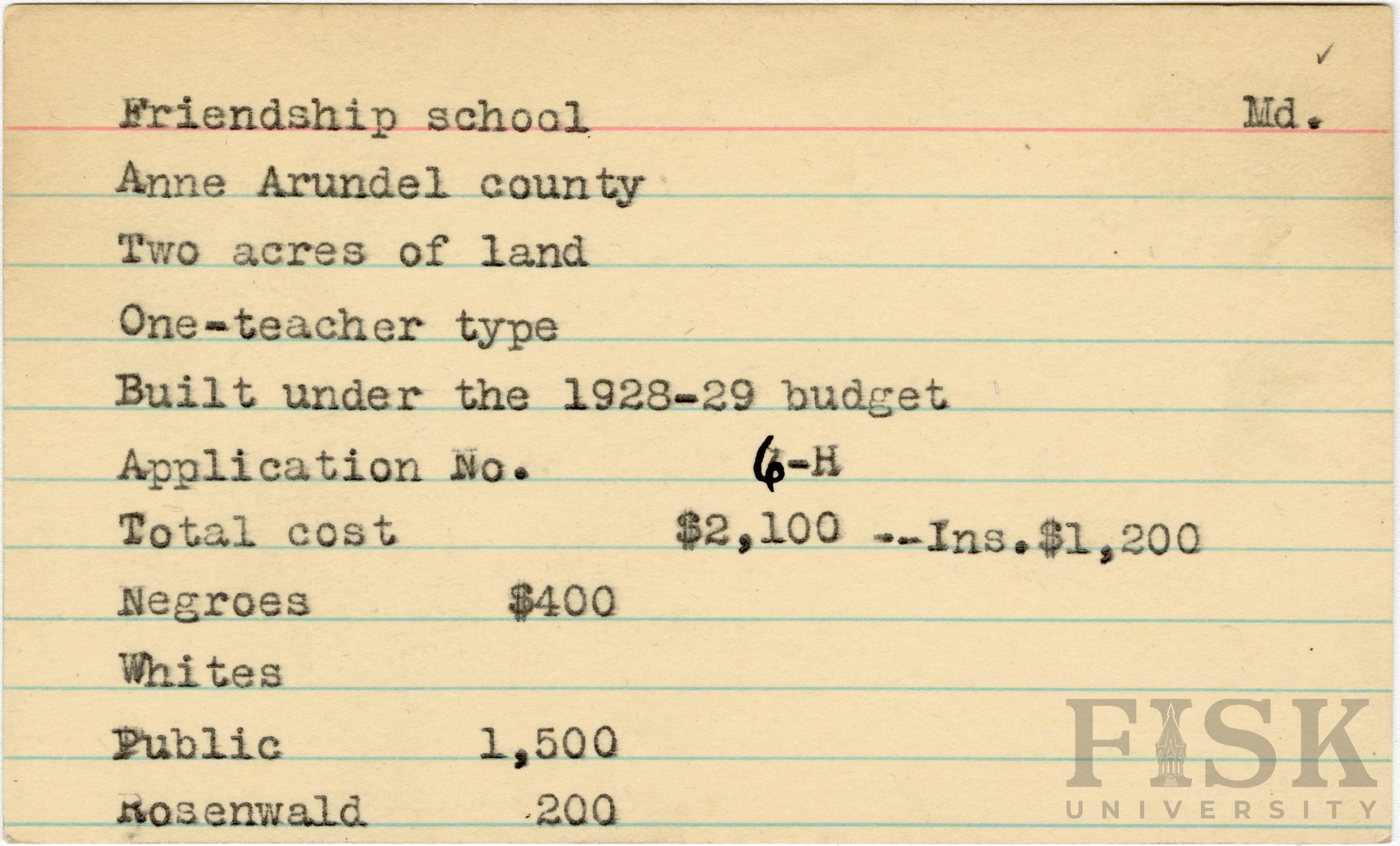 - School card from Rosenwald Fund for Friendship School in Anne Arundel County, Maryland with a section added to the budget contributions that says, "Ins. $1,200"