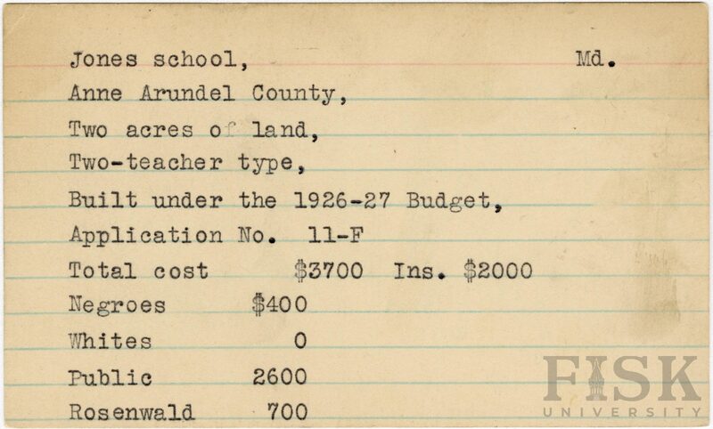 - School card from Rosenwald Fund for Jones School in Anne Arundel County, Maryland with a section added to the budget contributions that says, "Ins. $2,000"