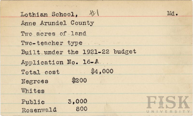 - School card from Rosenwald Fund for Lothian School No. 1 in Anne Arundel County, Maryland