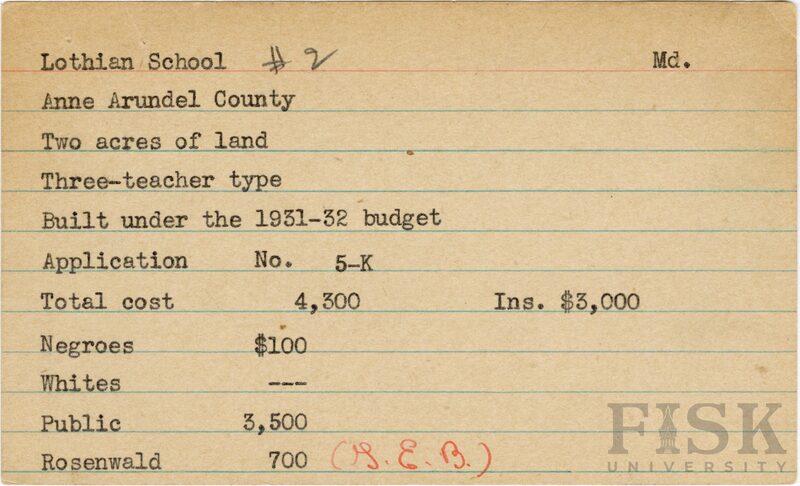 - School card from Rosenwald Fund for Lothian School No. 2 in Anne Arundel County, Maryland with a section added to the budget contributions that says, "Ins. $3,000" and a note next to the Rosenwald budget contribution that says, "(G.E.B.)"
