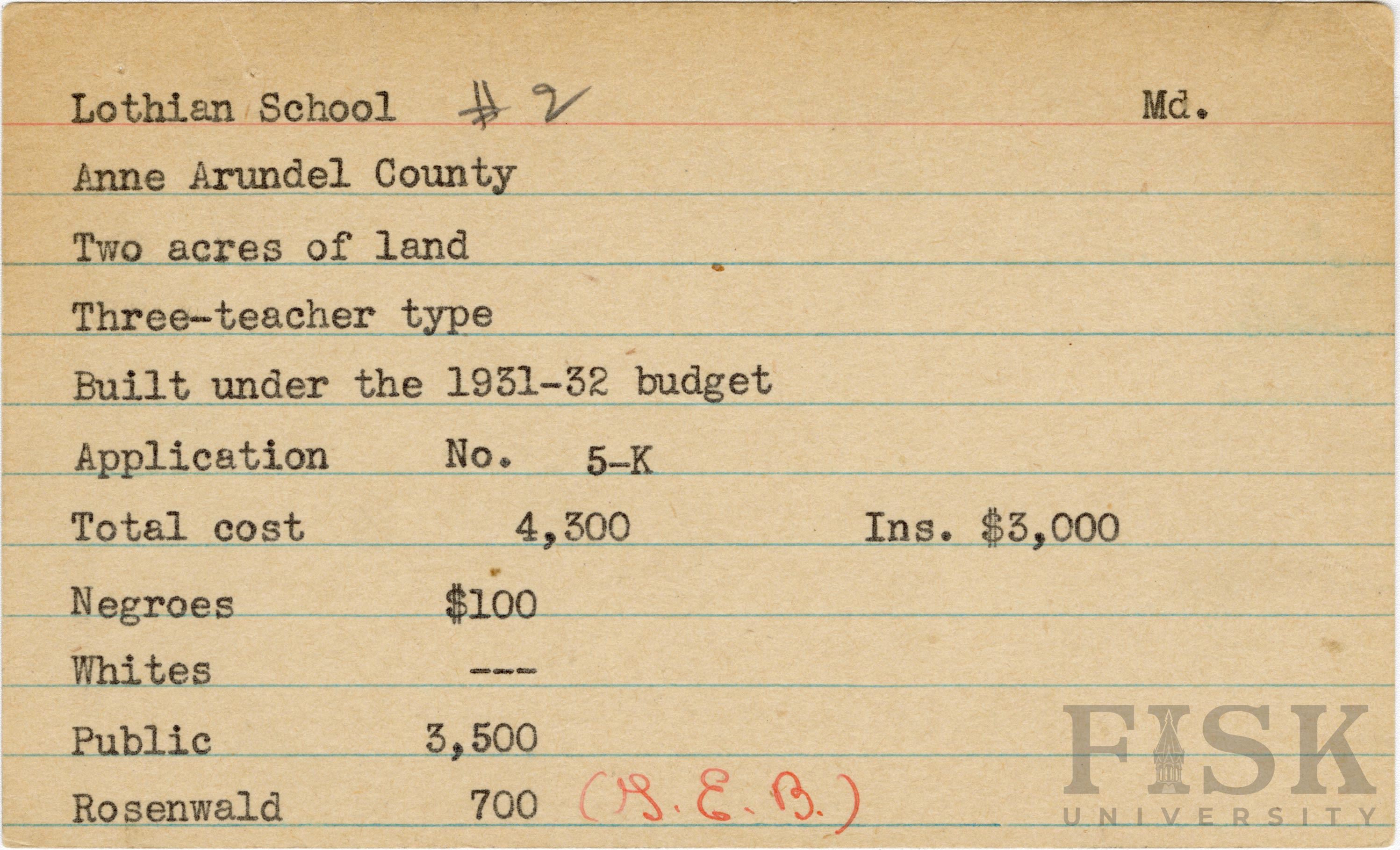 School card from Rosenwald Fund for Lothian School No. 2 in Anne Arundel County, Maryland with a section added to the budget contributions that says, "Ins. $3,000" and a note next to the Rosenwald budget contribution that says, "(G.E.B.)"
