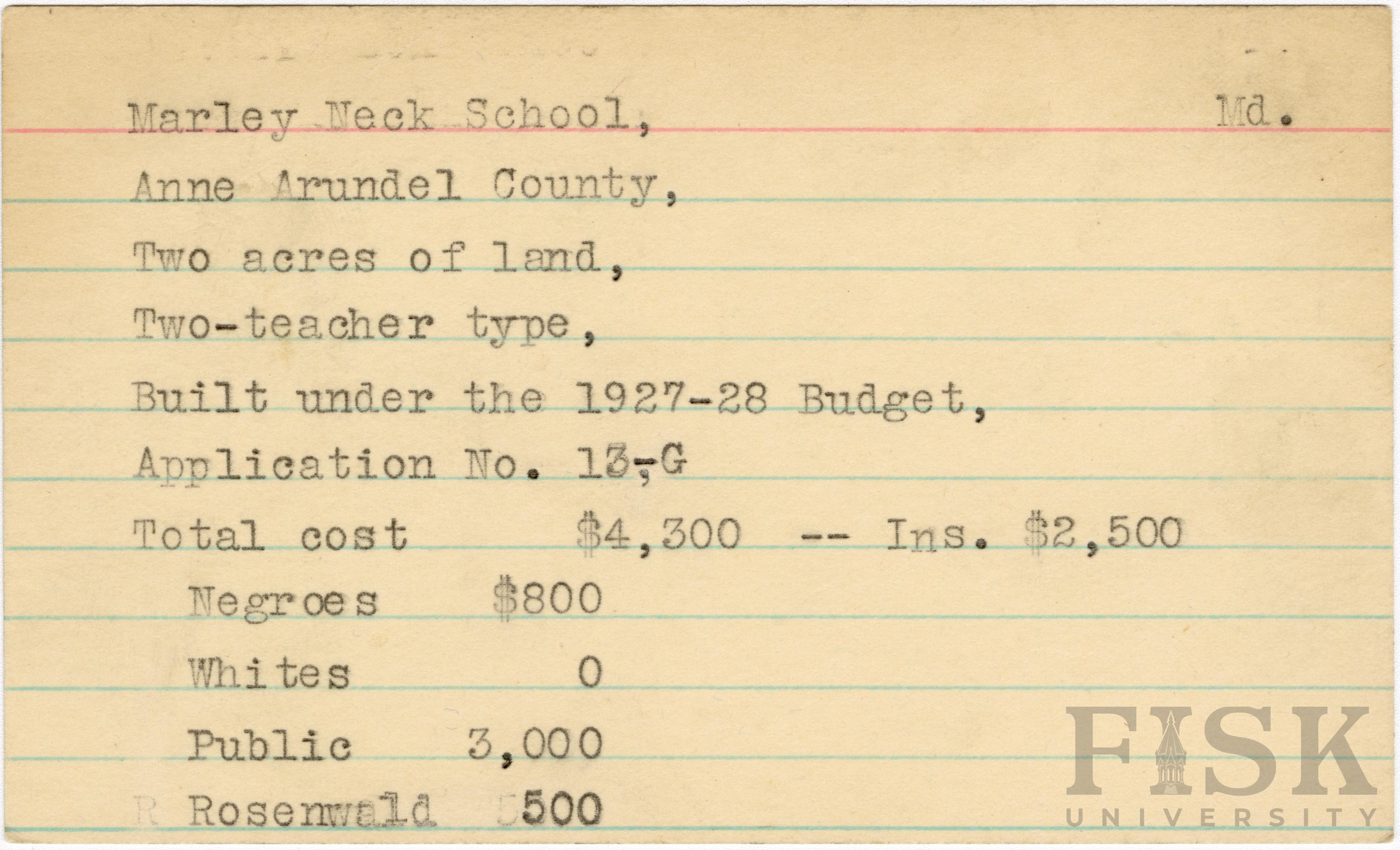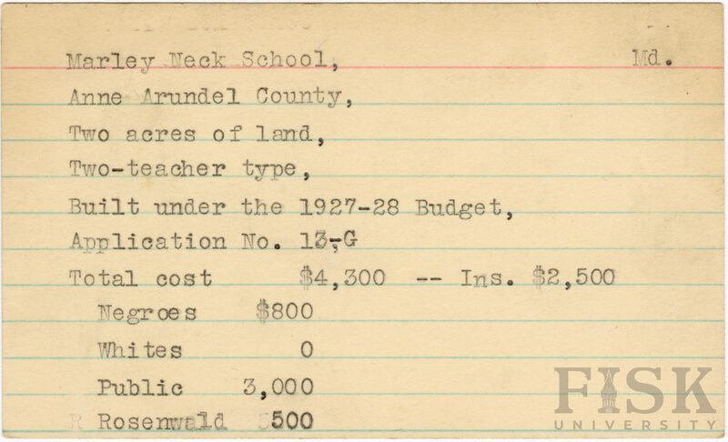 - School card from Rosenwald Fund for Marley Neck School in Anne Arundel County, Maryland with a section added to the budget contributions that says, "Ins. $2,500"