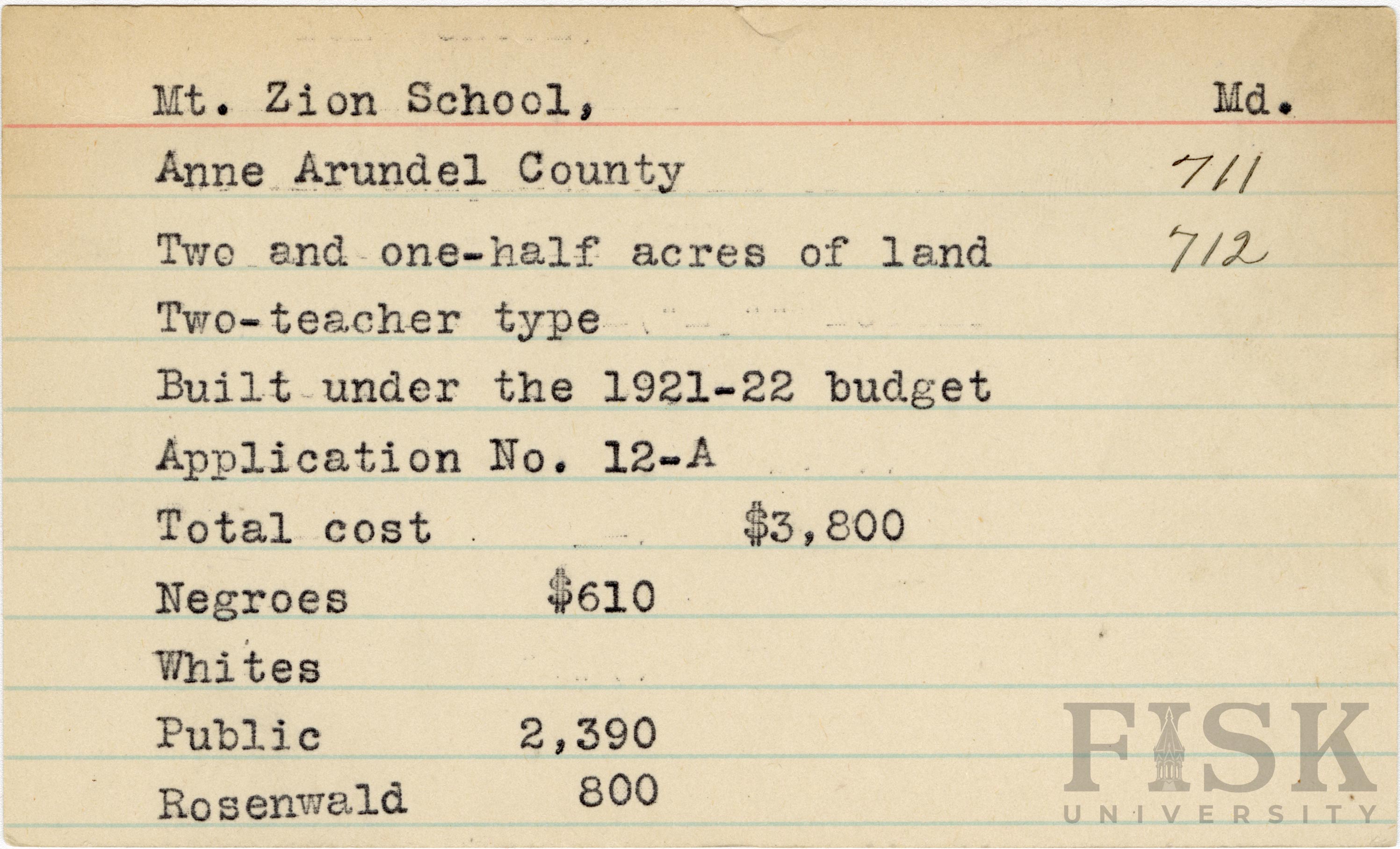 School card from Rosenwald Fund for Mt. Zion School in Anne Arundel County, Maryland