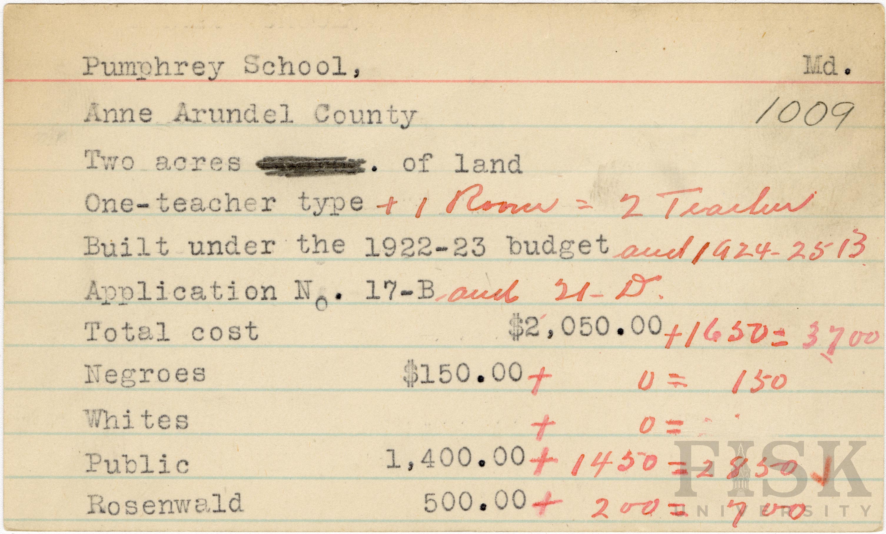 School card from Rosenwald Fund for Pumphrey School in Anne Arundel County, Maryland with handwritten additions to the teacher type, budget year, application number, and budget contribution sections