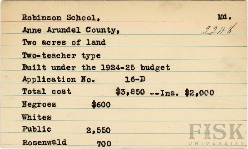 - School card from Rosenwald Fund for Robinson School in Anne Arundel County, Maryland with a section added to the budget contributions that says, "Ins. $2,000"