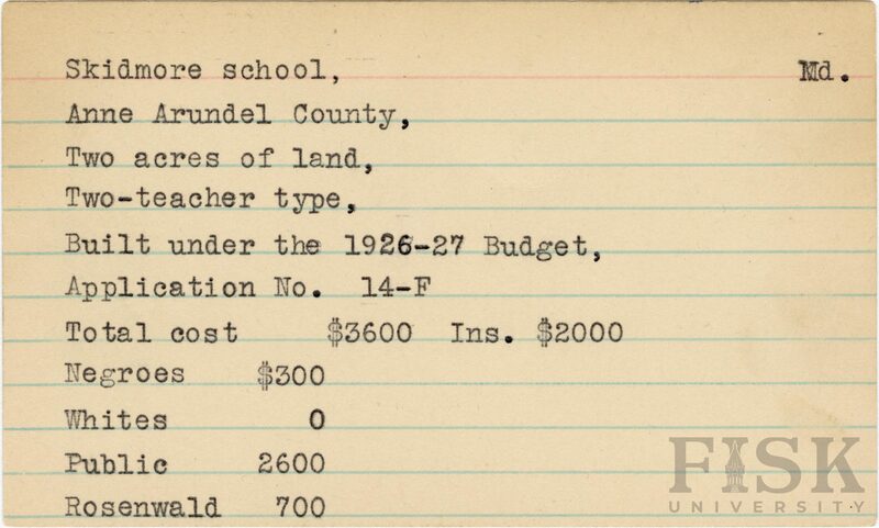 - School card from Rosenwald Fund for Skidmore School in Anne Arundel County, Maryland with a section added to the budget contributions that says, "Ins. $2,000"