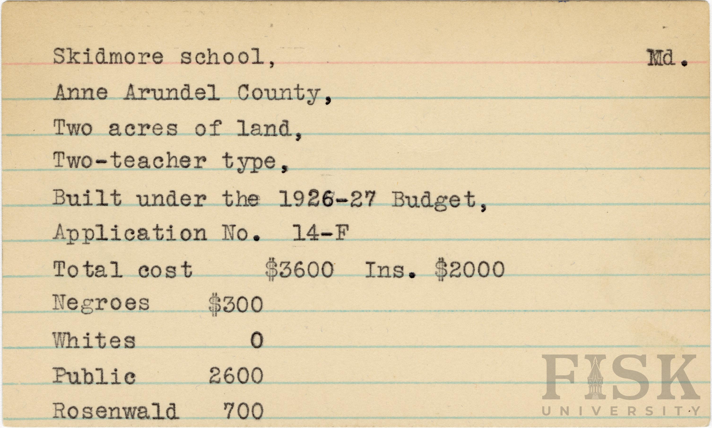 School card from Rosenwald Fund for Skidmore School in Anne Arundel County, Maryland with a section added to the budget contributions that says, "Ins. $2,000"