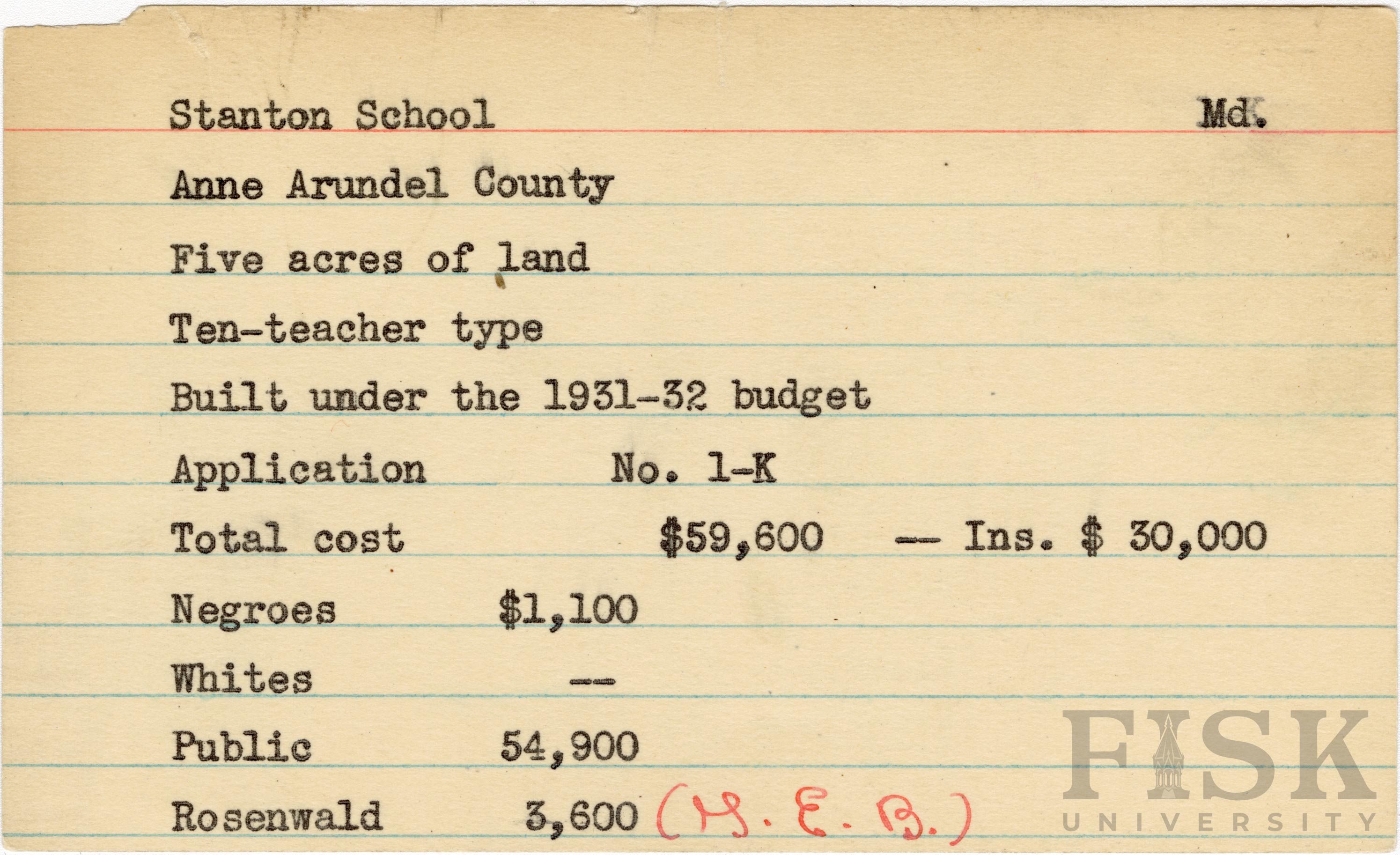 School card from Rosenwald Fund for Stanton School in Anne Arundel County, Maryland with a section added to the budget contributions that says, "Ins. $30,000" and a note next to the Rosenwald budget contribution that says, "(G.E.B.)"