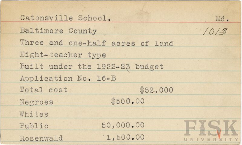 - School card from Rosenwald Fund for Catonsville School in Baltimore County, Maryland