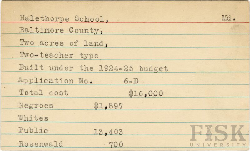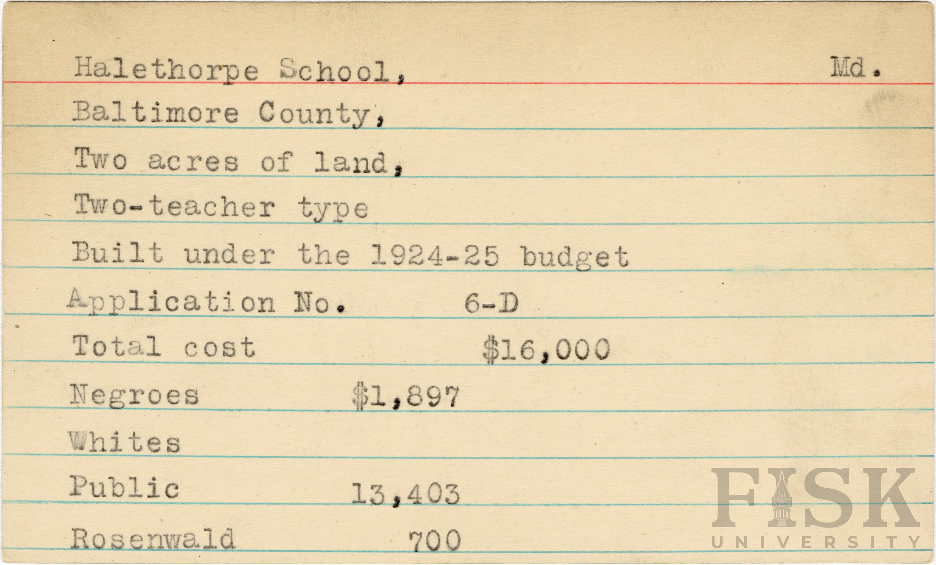 - School card from Rosenwald Fund for Halethorpe School in Baltimore County, Maryland