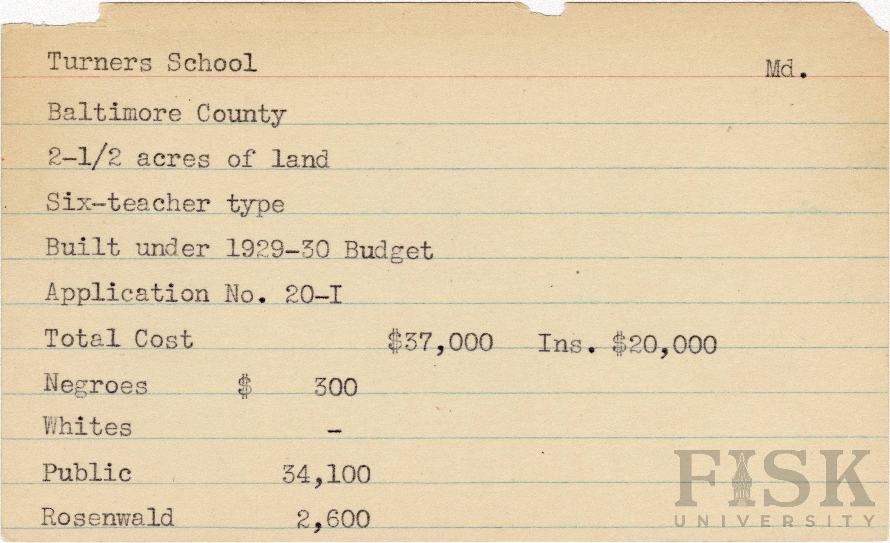 School card from Rosenwald Fund for Turners School in Baltimore County, Maryland with a section added to the budget contributions that says, "Ins. $20,000"