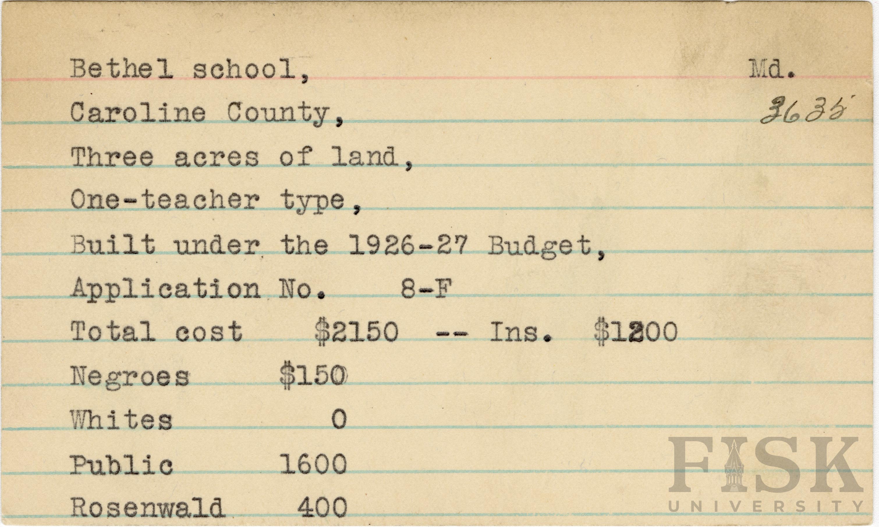 - School card from Rosenwald Fund for Bethel School in Caroline County, Maryland with a section added to the budget contributions that says, "Ins. $1,200"