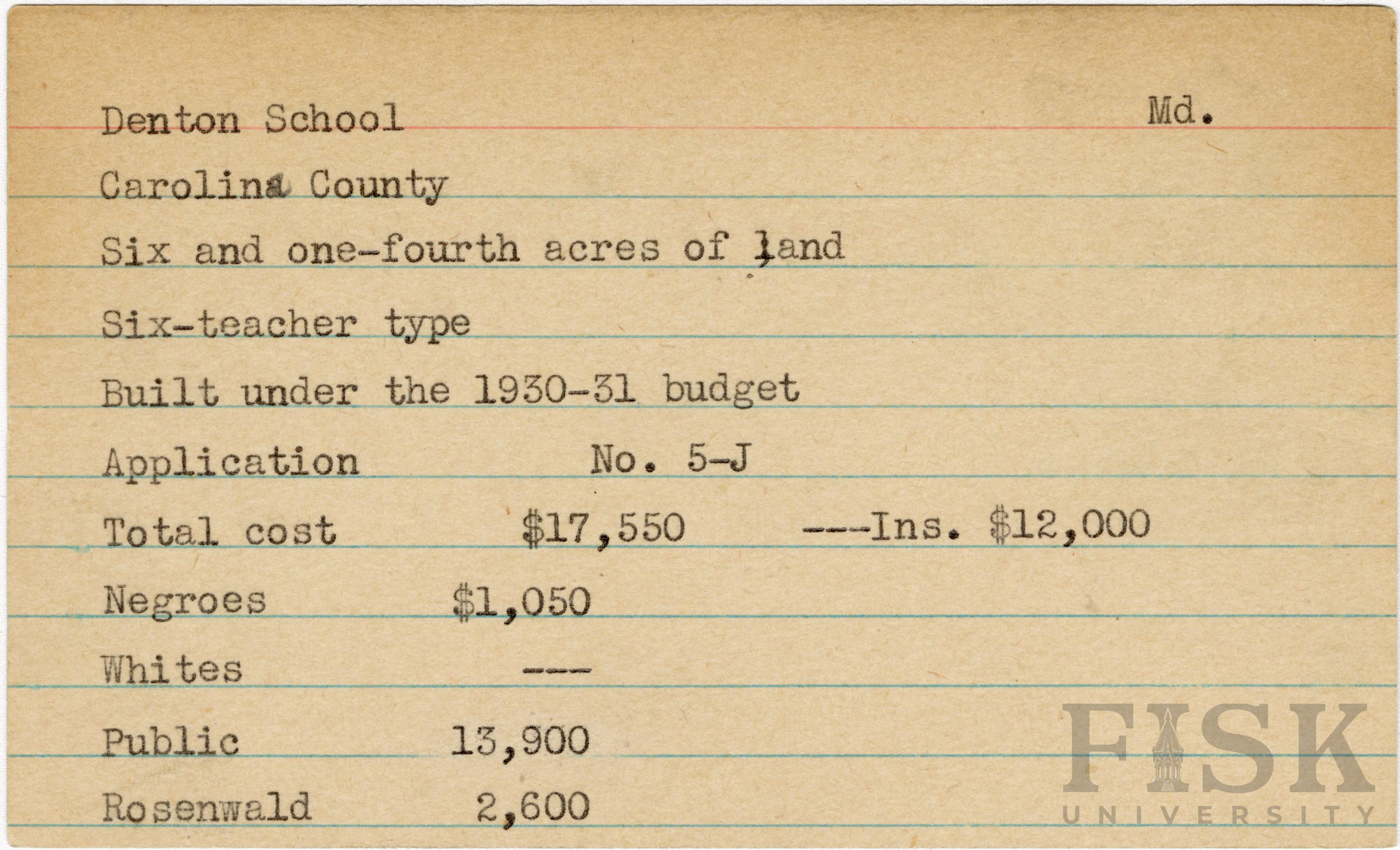 School card from Rosenwald Fund for Denton School in Caroline County, Maryland with a section added to the budget contributions that says, "Ins. $12,000"