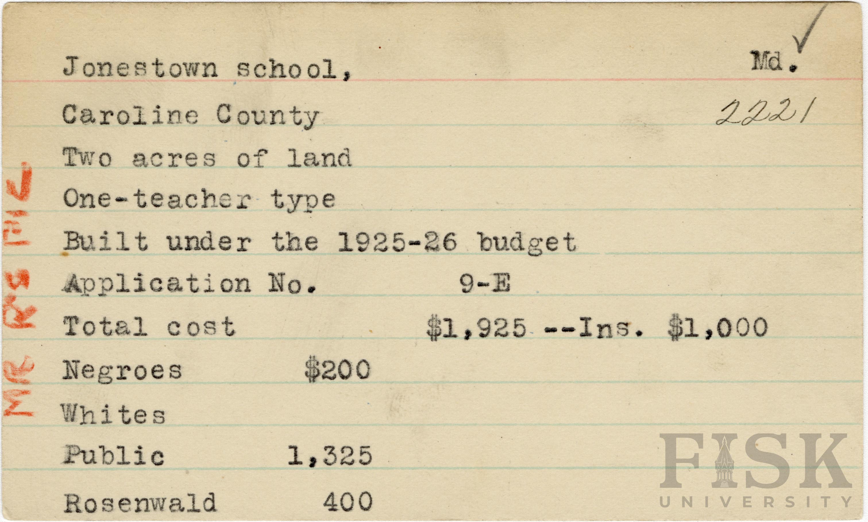 - School card from Rosenwald Fund for Jonestown School in Caroline County, Maryland with a section added to the budget contributions that says, "Ins. $1,000" and a handwritten note on the far left of the card that says, "Mr. R's Pic"