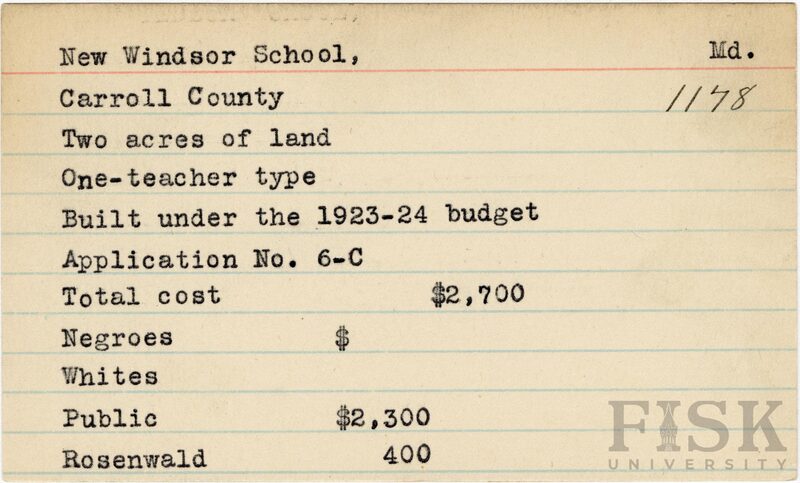- School card from Rosenwald Fund for New Windsor School in Carroll County, Maryland