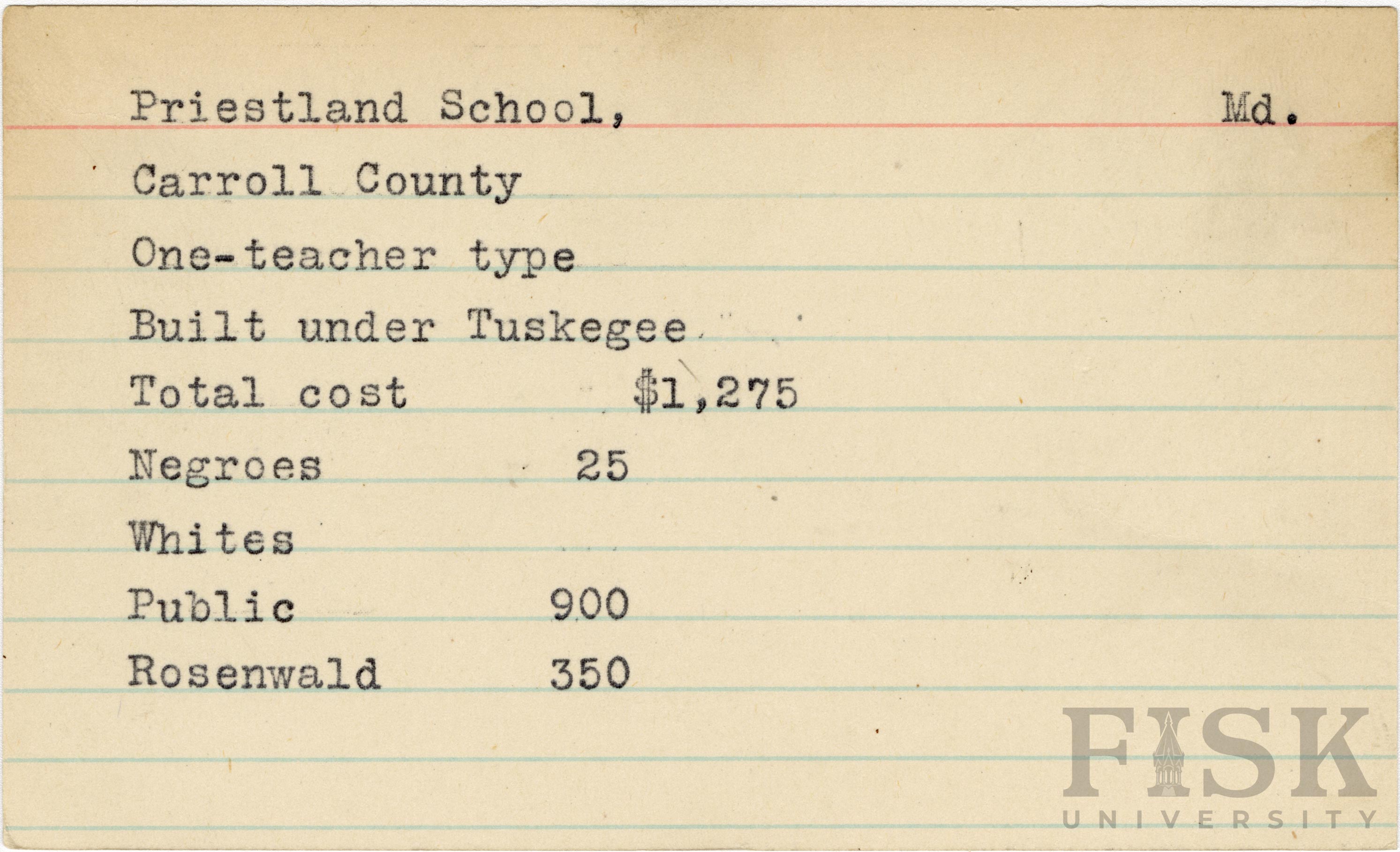 - School card from Rosenwald Fund for Priestland School in Carroll County, Maryland